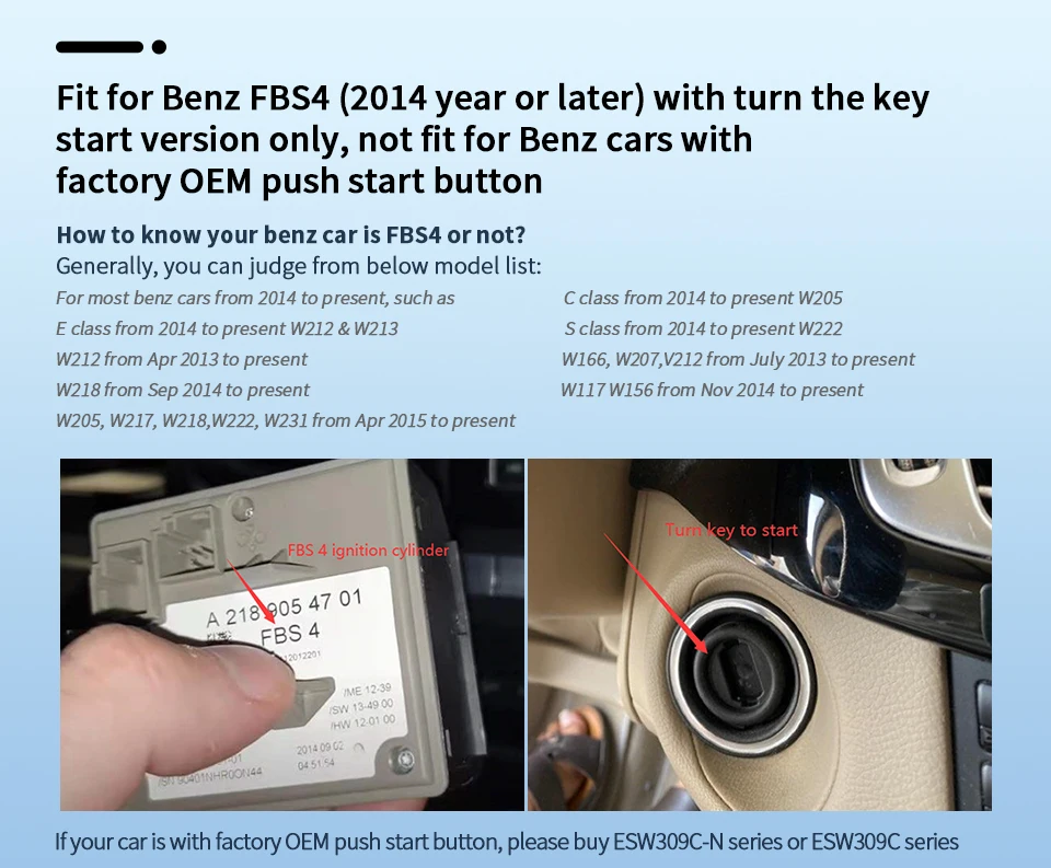 Fit for Benz FBS4(2014 year or later) with turn the key start version only, not fit for Benz cars with factory OEM push start button