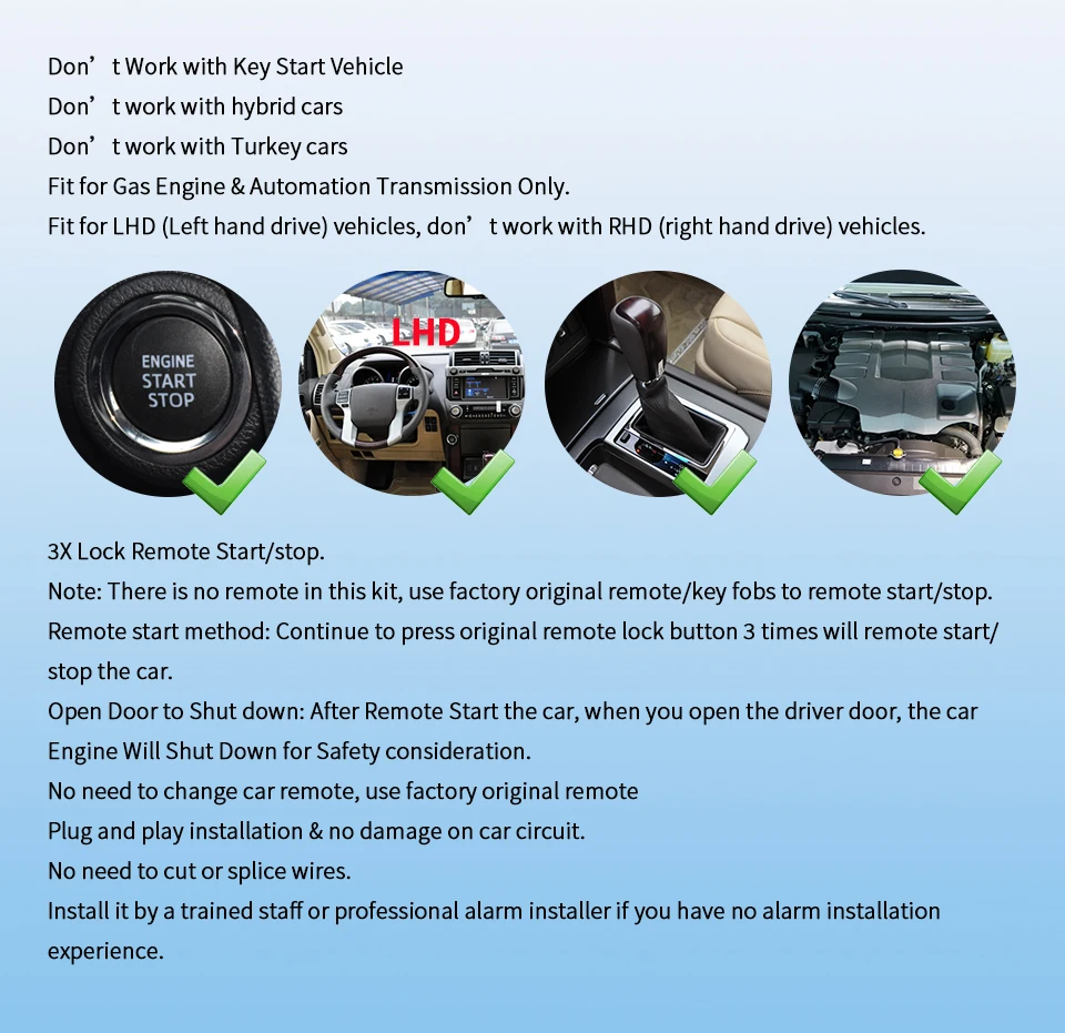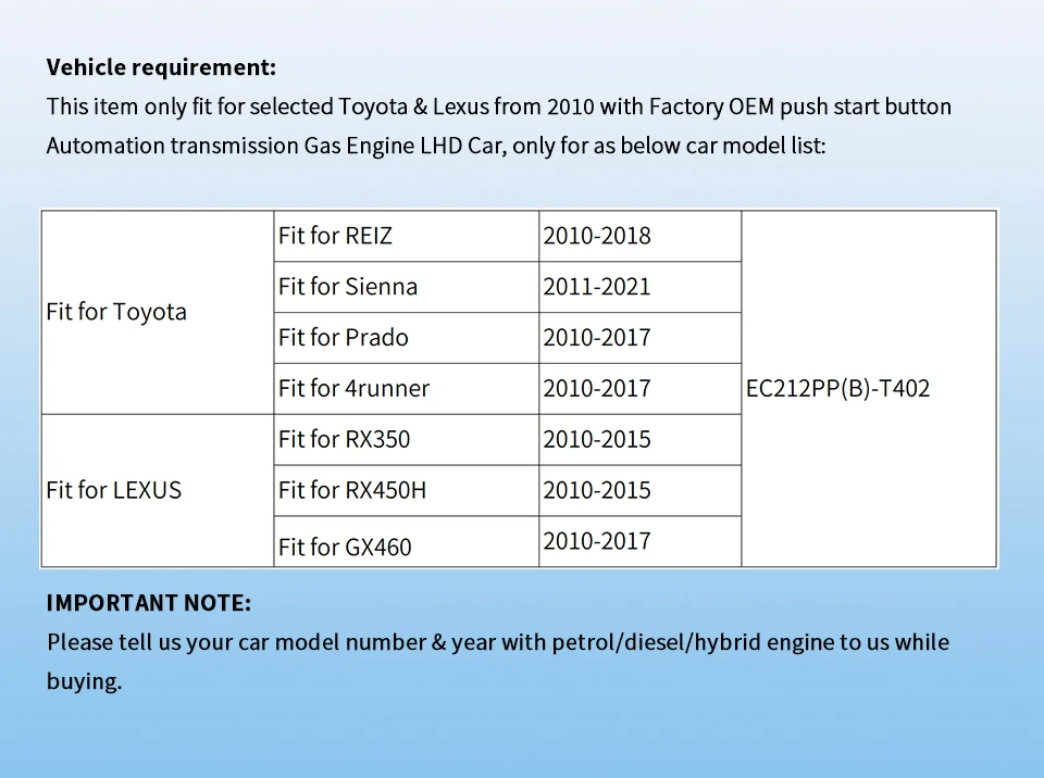 This item only fit for selected Toyota & Lexus with Factory OEM push start button Automation transmission Gas/diesel Engine LHD Car