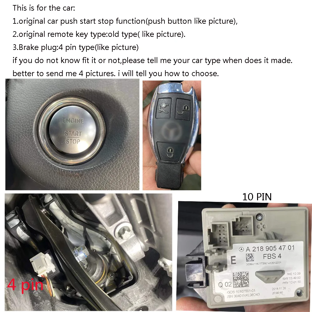 CLS class(year 2013-2019,automatic transmission car,original car with push start function-keyless start function,brake cable:4pin),if your car need insert key,turn it to start stop car engine,it can not work,please choose other type.