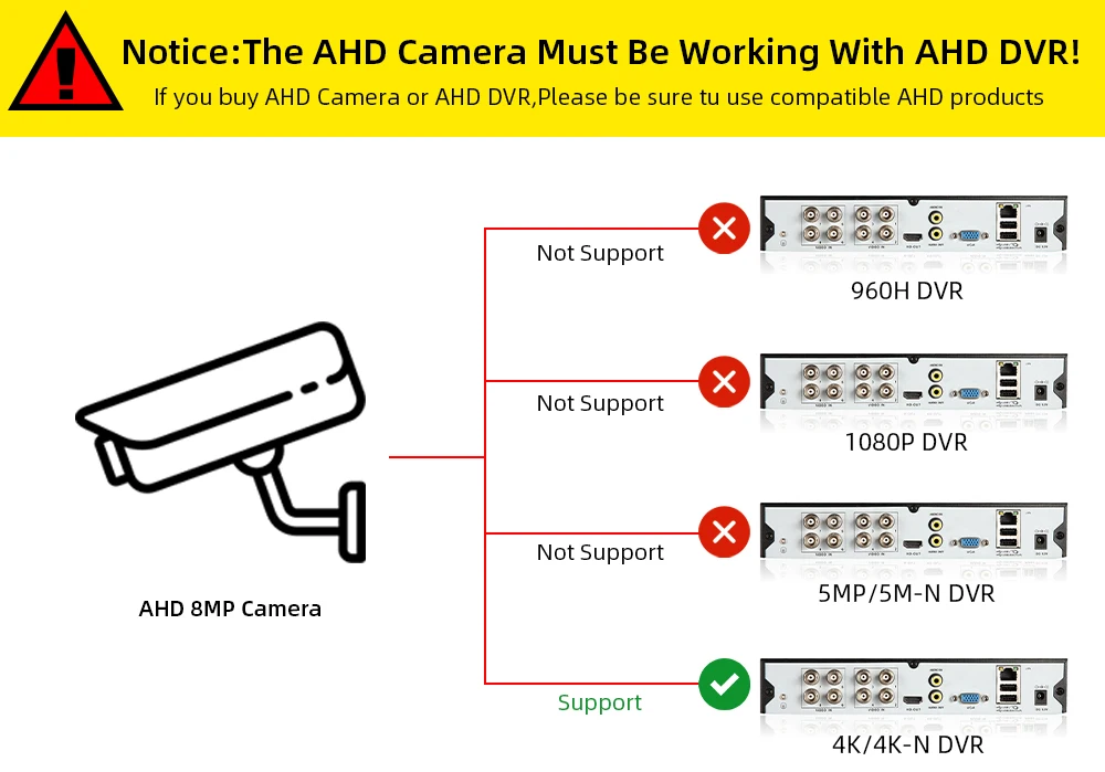 This is Super HD 8MP Camera ,Work Must use 4K AHD DVR or 4K-N AHD DVR !!!!, If no have, 8MP AHD Camera Not Work .Can't use “AHD 5MP System””AHD 5M-N System”and”AHD-H 1080P System”,”AHD 1080N System” and “AHD AHD-M 720P System” AHD DVR or “Common DVR” ,The 8MP AHD Camera Not Work!!!