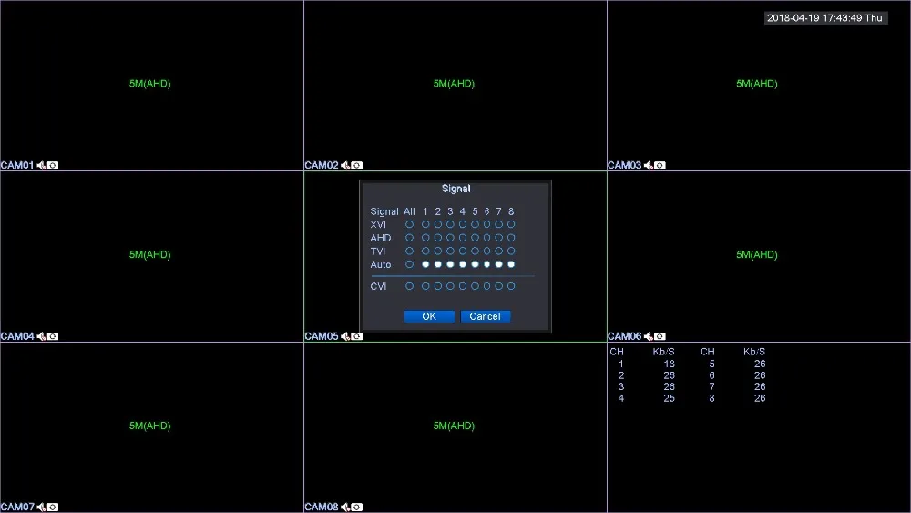8*5M@11fps/8*4M@15fps(AHD)/ 8*3M@18fps(AHD)/ 8*1080P(5 in 1) |