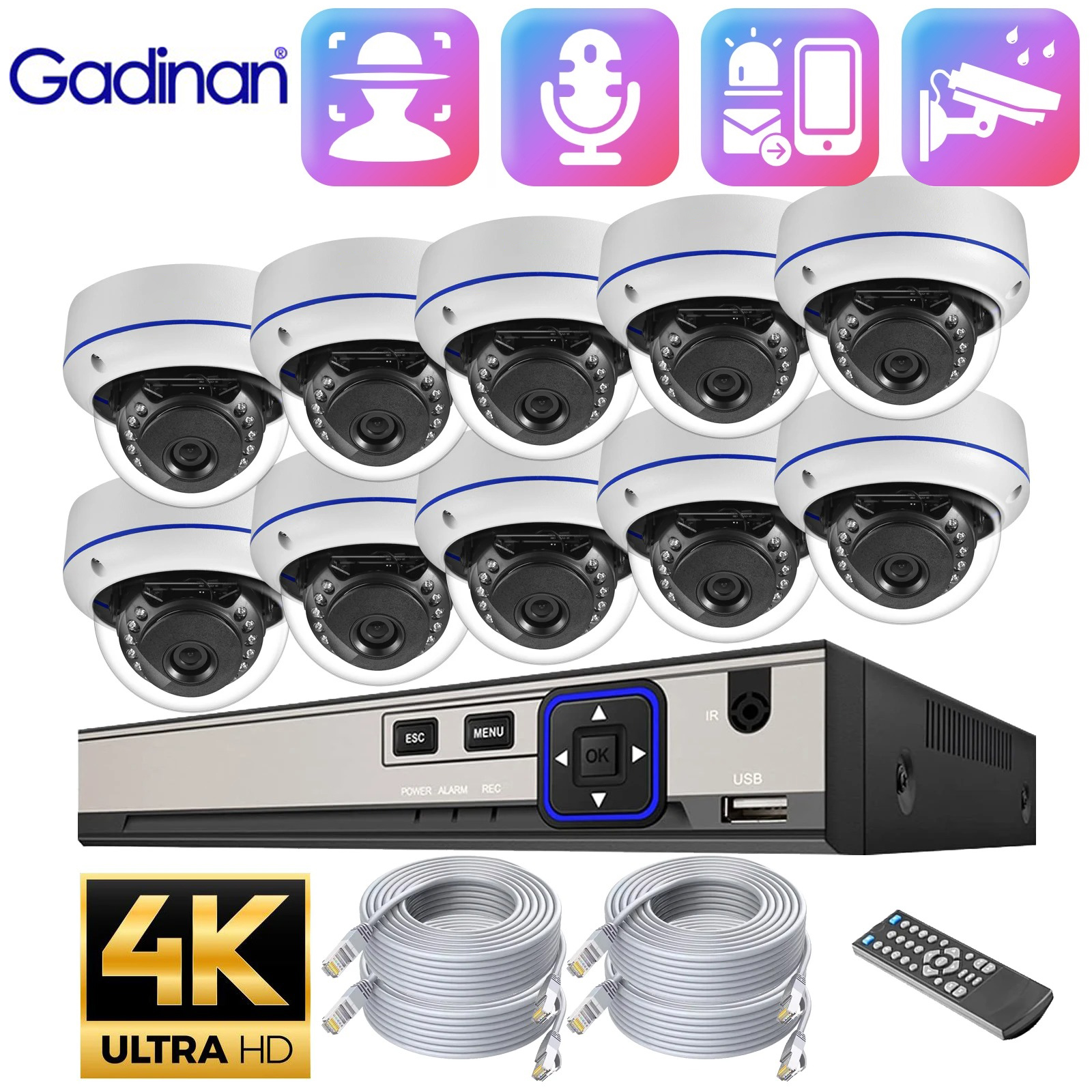 Gadinan Dome Security Monitor System 4K 8MP IP Camera Set Face Detection 10CH NVR Audio CCTV Video Surveillance Protection Kit