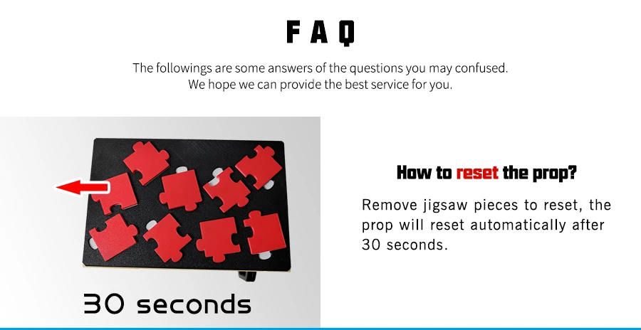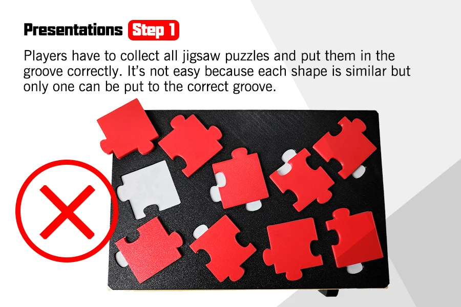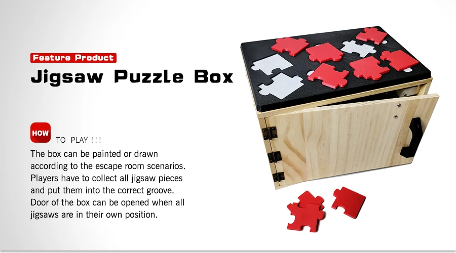 The box can be painted or drawn according to the escape room scenarios. Players have to collect all jigsaw pieces and put them into the correct groove. Door of the box can be opened when all jigsaws are in their own position.
