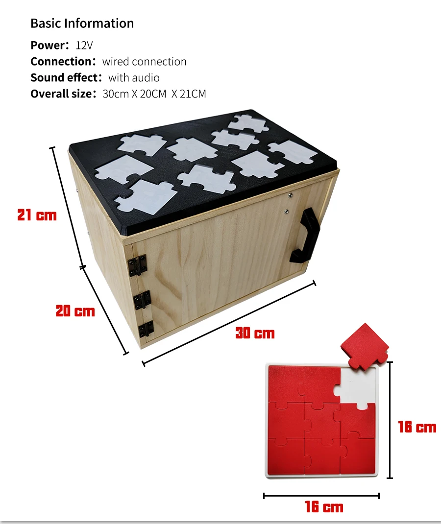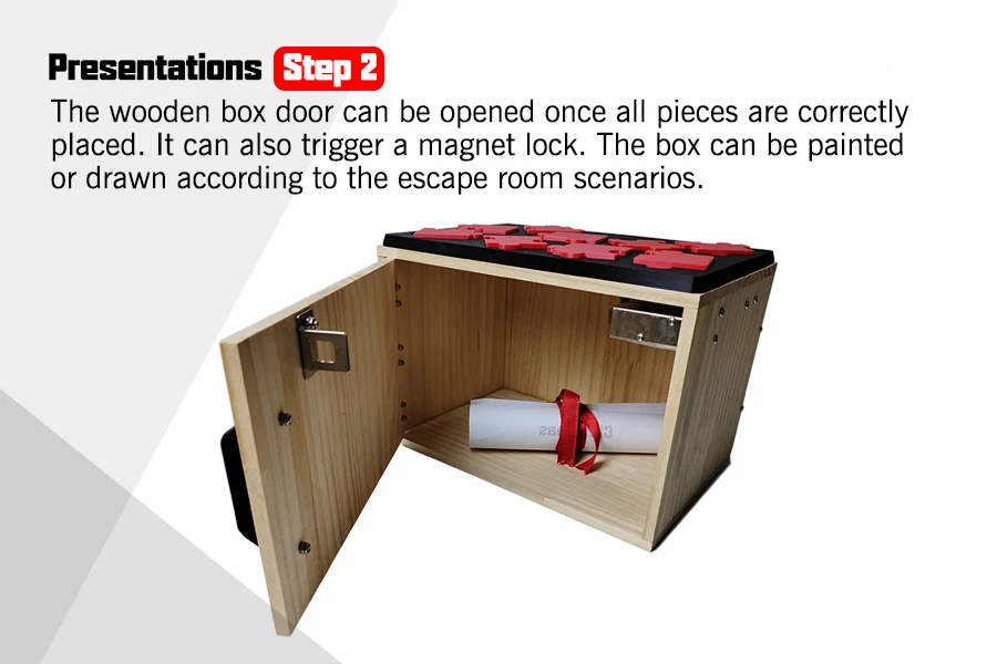 The wooden box door can be opened once all pieces are correctly placed. It can also trigger a magnet lock. The box can be painted or drawn according to the escape room scenarios.