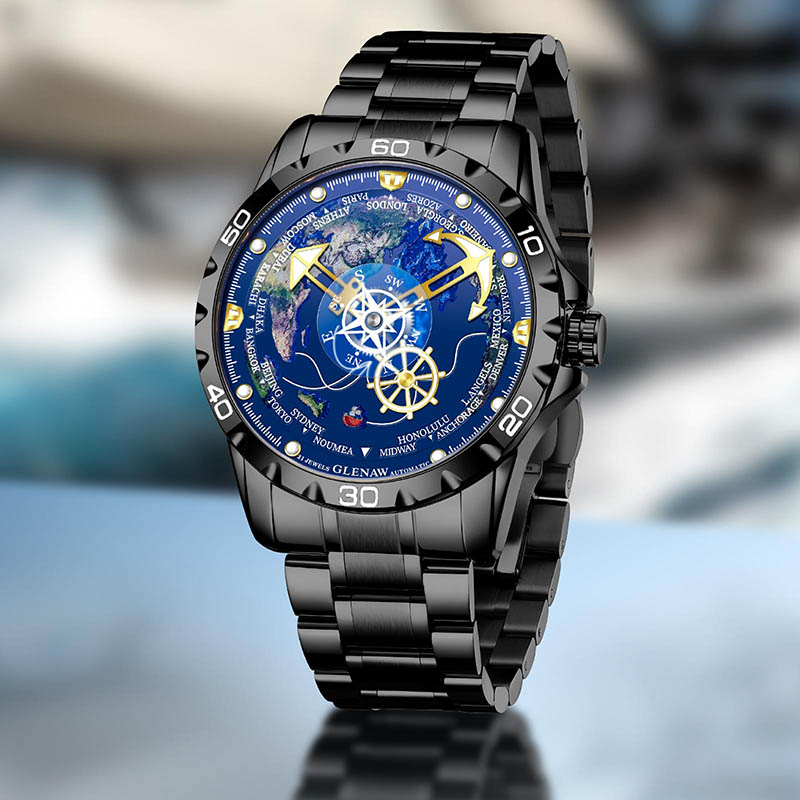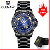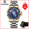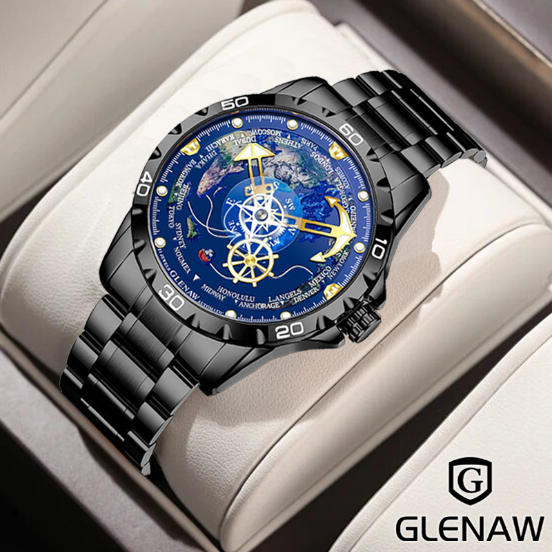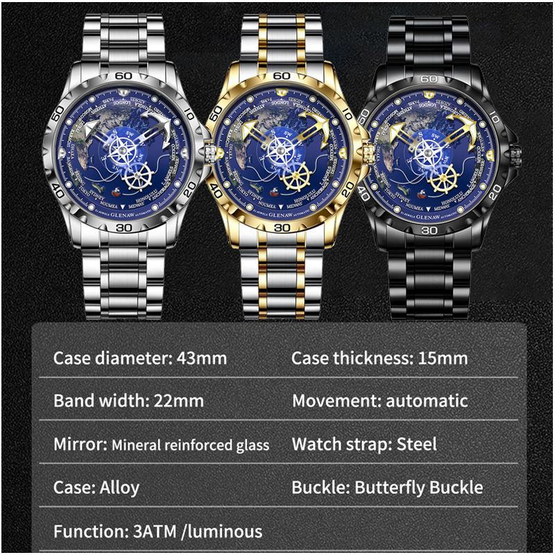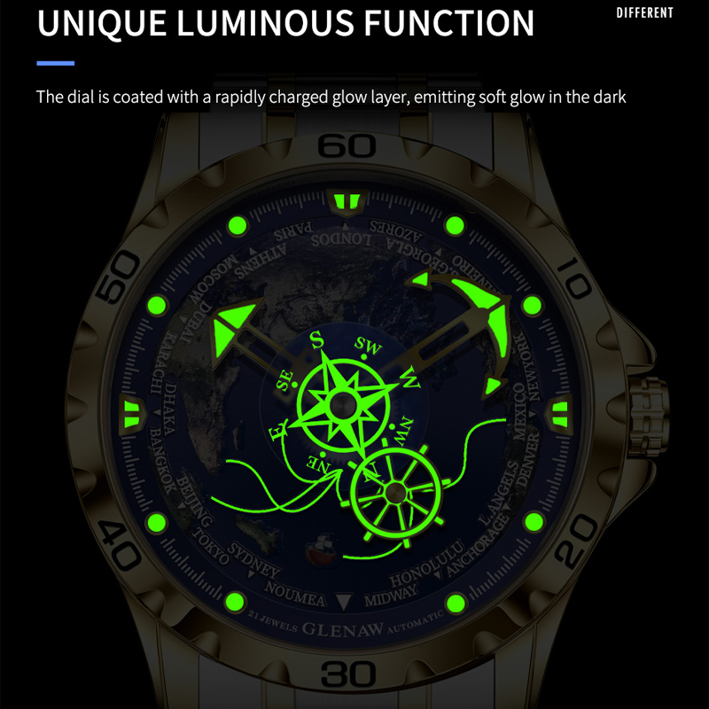 GLENAW Design NEW Earth Dial Mechanical Watch Men Stainless Steel Night Light Waterproof Top Luxury Automatic Mechanical Watch