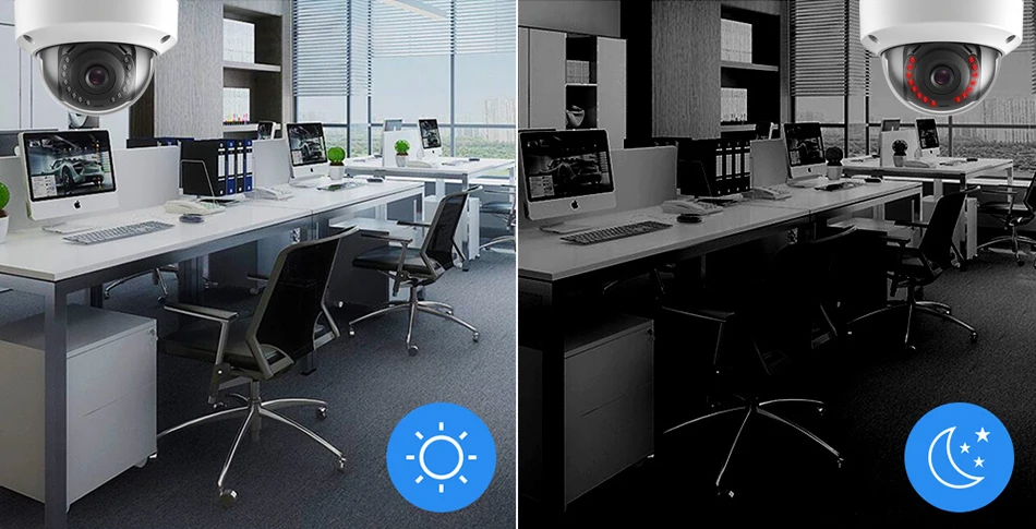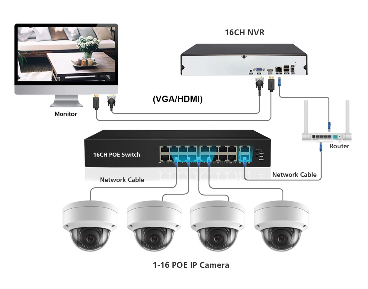 Power over Ethernet means the IP cameras connect to with a single cable that transmits both data and power. No power adapter is required, lower risk of electric leakage and easy to set up, the Poe camera Connection to Poe NVR Support Max 250 meter transmission Distance via Network cable