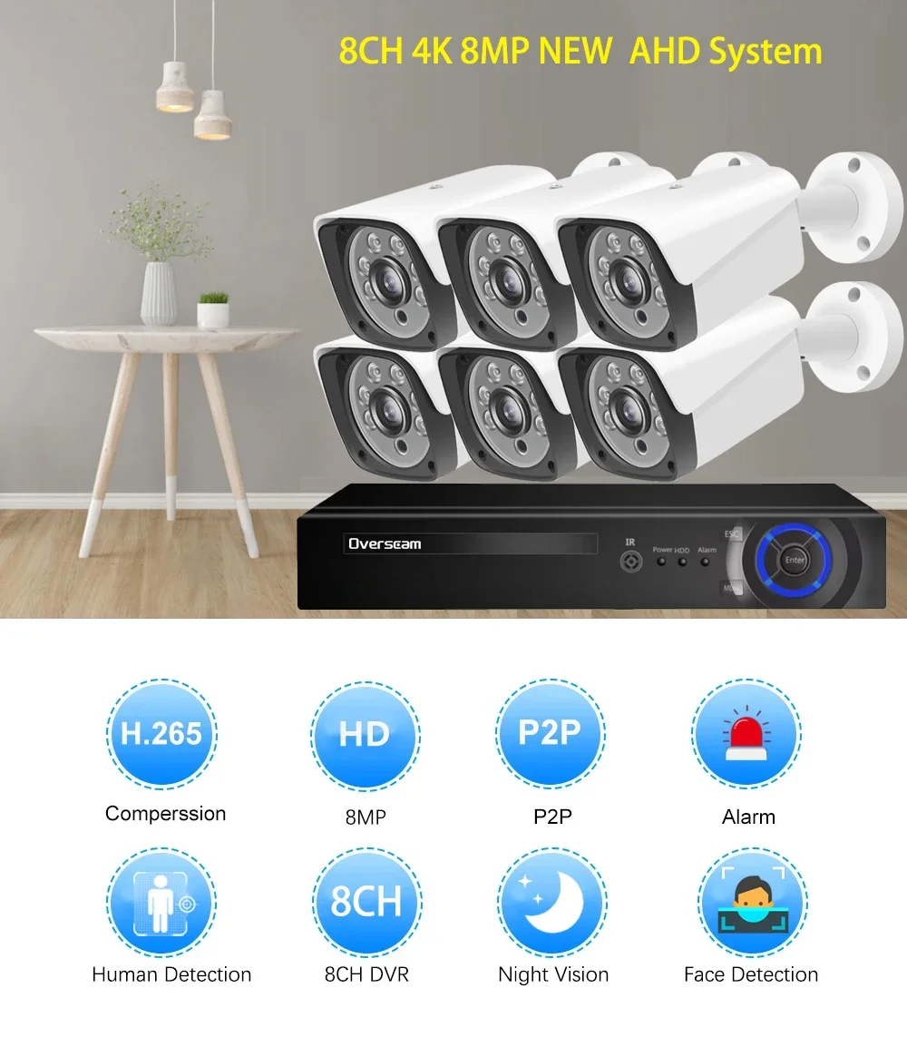HD 4K 8MP AHD Camera System Set IR Night Vision H.265 Human Detection CCTV 8CH 6 In 1AHD DVR Video Surveillance Xmeye System