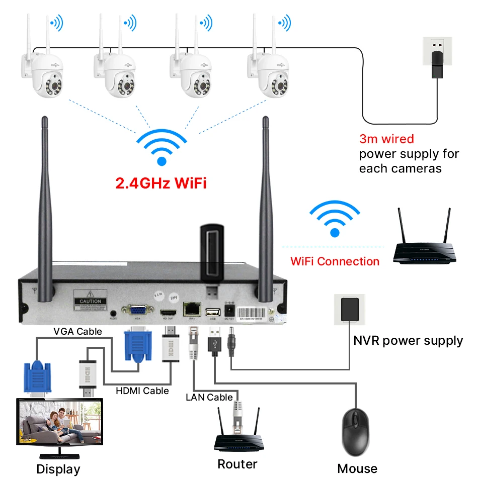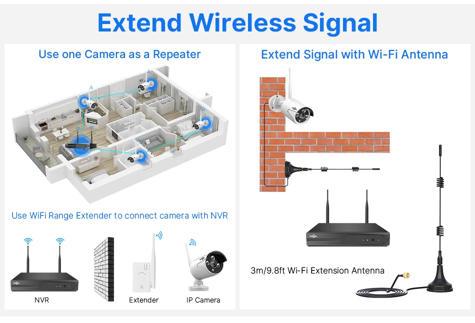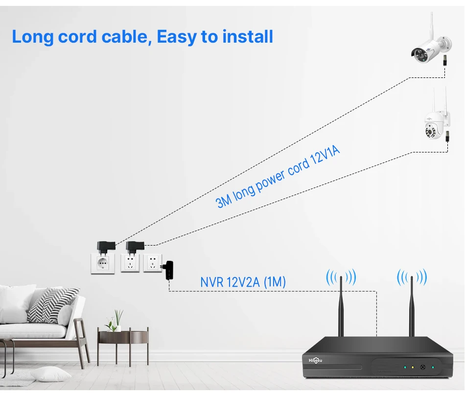 Theoretically, it's maximum wireless distance is 50M if no any obstacles.this wireless system uses the latest wireless cascading technology. When the camera is far away from the NVR, wireless cascade technology allows the camera to transmit the signal to another camera closest to it. The wireless cascade technology greatly improves the transmission distance and stability.