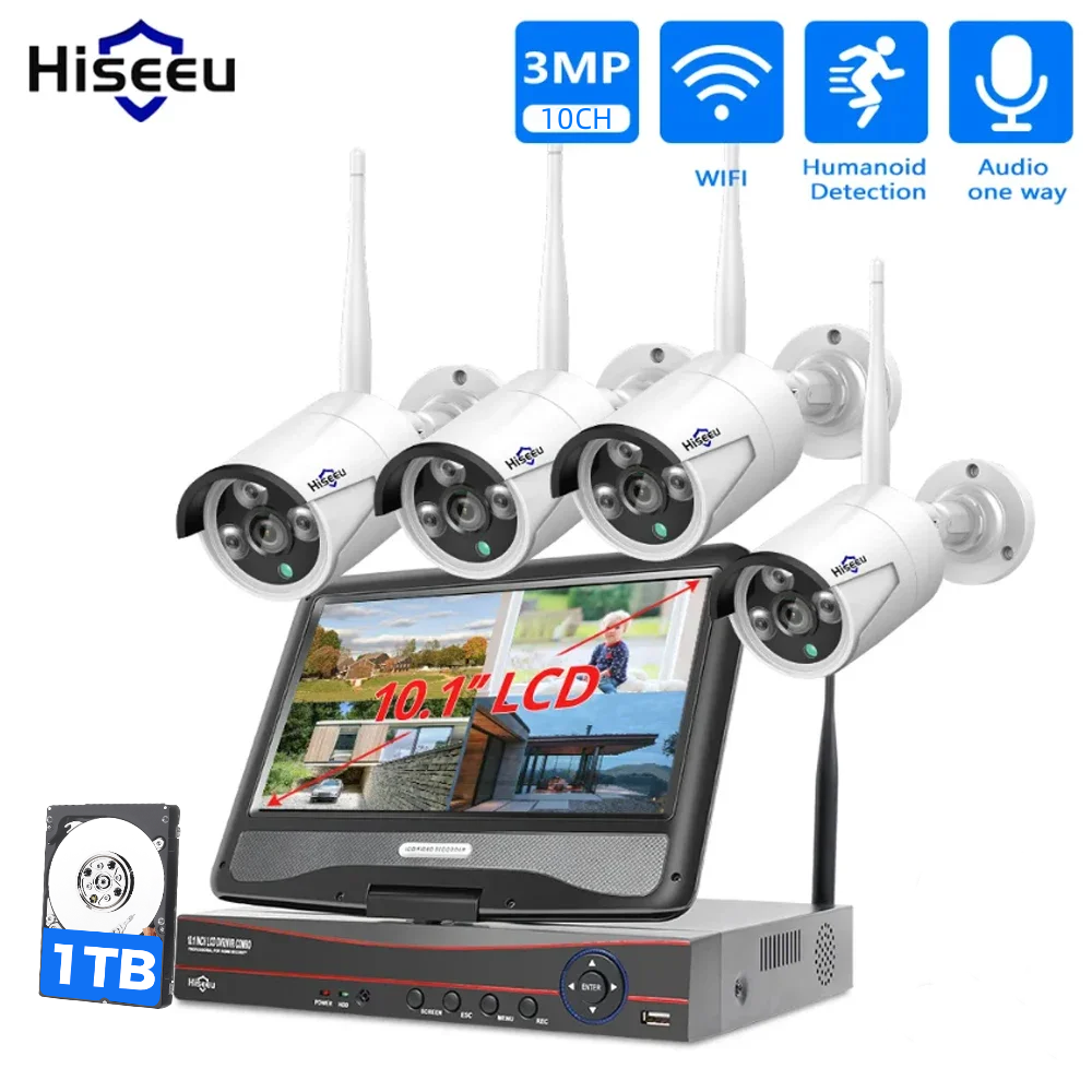 Hiseeu 3/5MP Wireless Security Cameras Kit Outdoor Waterproof IP Camera Surveillance CCTV System Set with 10.1″ Monitor 10CH NVR