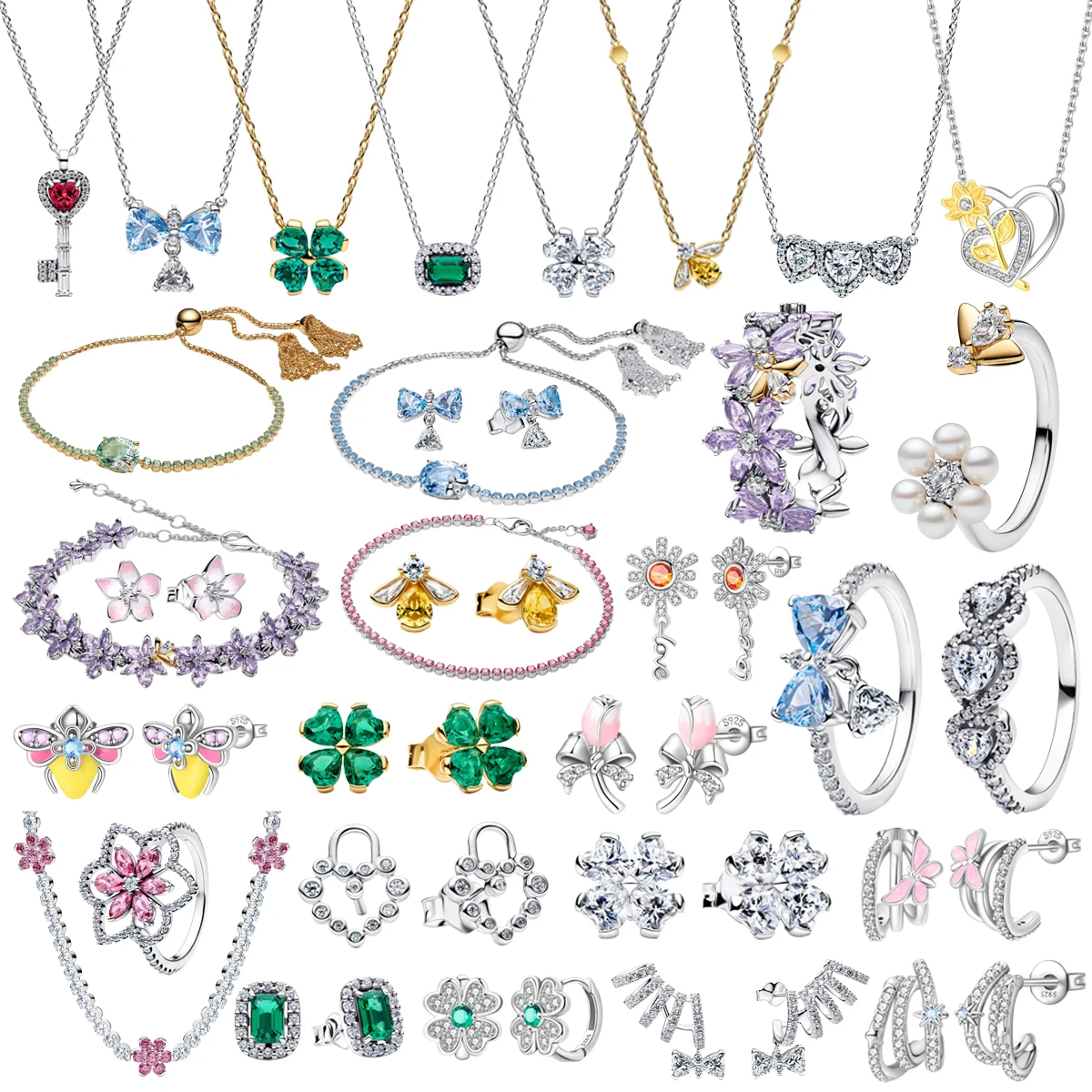 Hot Selling 925 Tulip Bow Four-leaf Clover Heart-shaped Adjustable Bracelet Earrings Ring fit Women’s Birthday Jewelry Set Gift