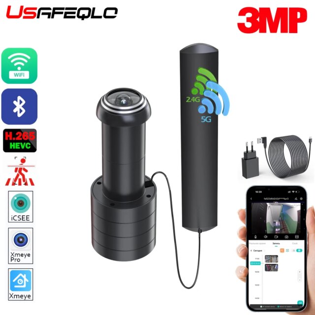 An ultra-large advertising camera with Wi-Fi functionality, compatible with the icsee mobile app and equipped with video recording capability.iCSEE Door Eye Hole Security 3MP HD 1.7mm Lens Wide Angle FishEye CCTV Network Mini Peephole Door Wifi Camera P2P Xmeye VMS
