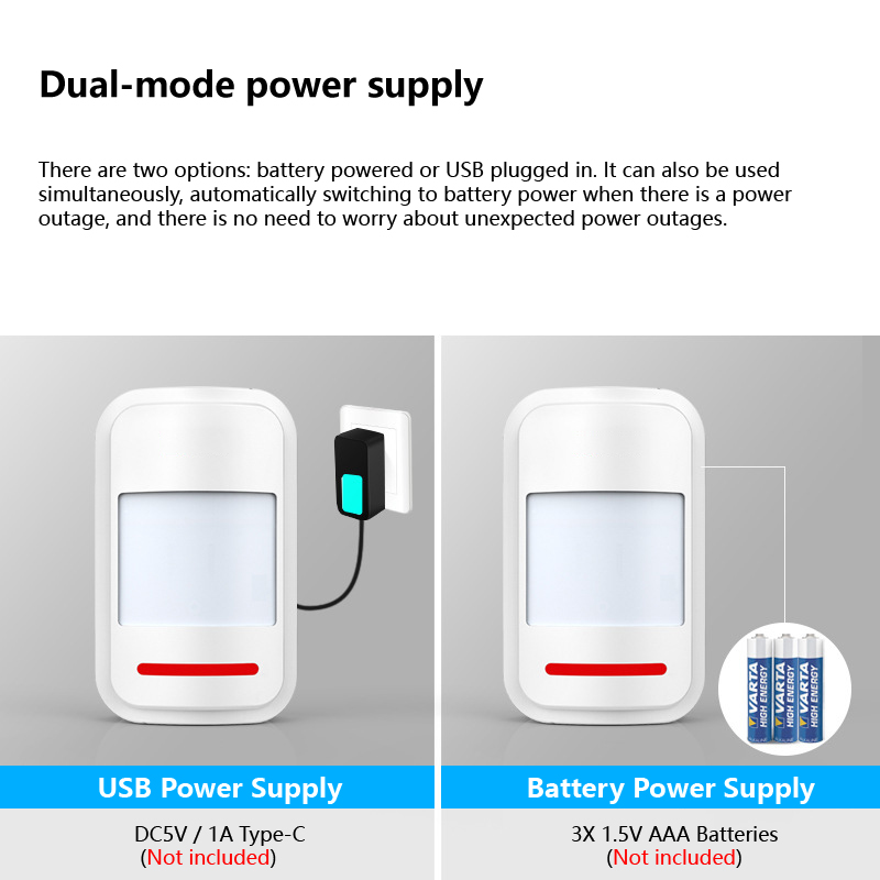 Supports battery and USB cable power supply. It is also possible to use two power supply modes at the same time, and switch to battery power supply after power outage, without worrying about the equipment stopping working due to power outage.