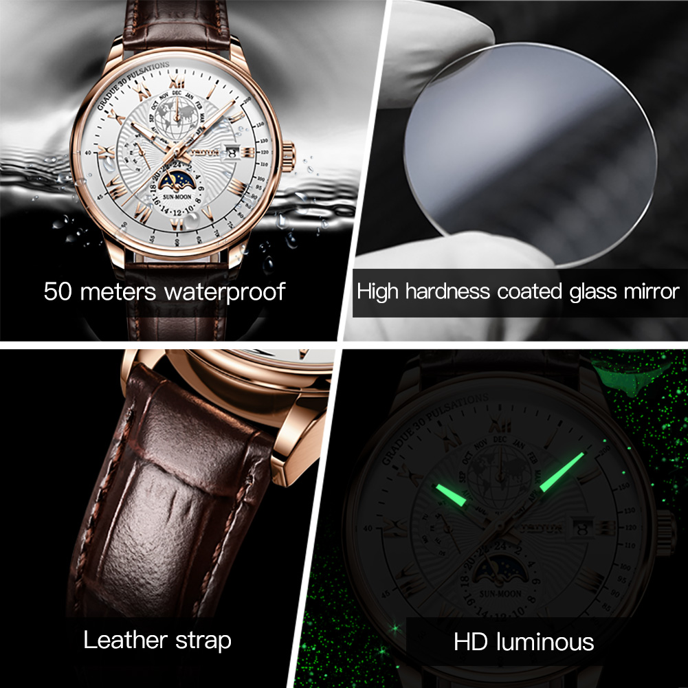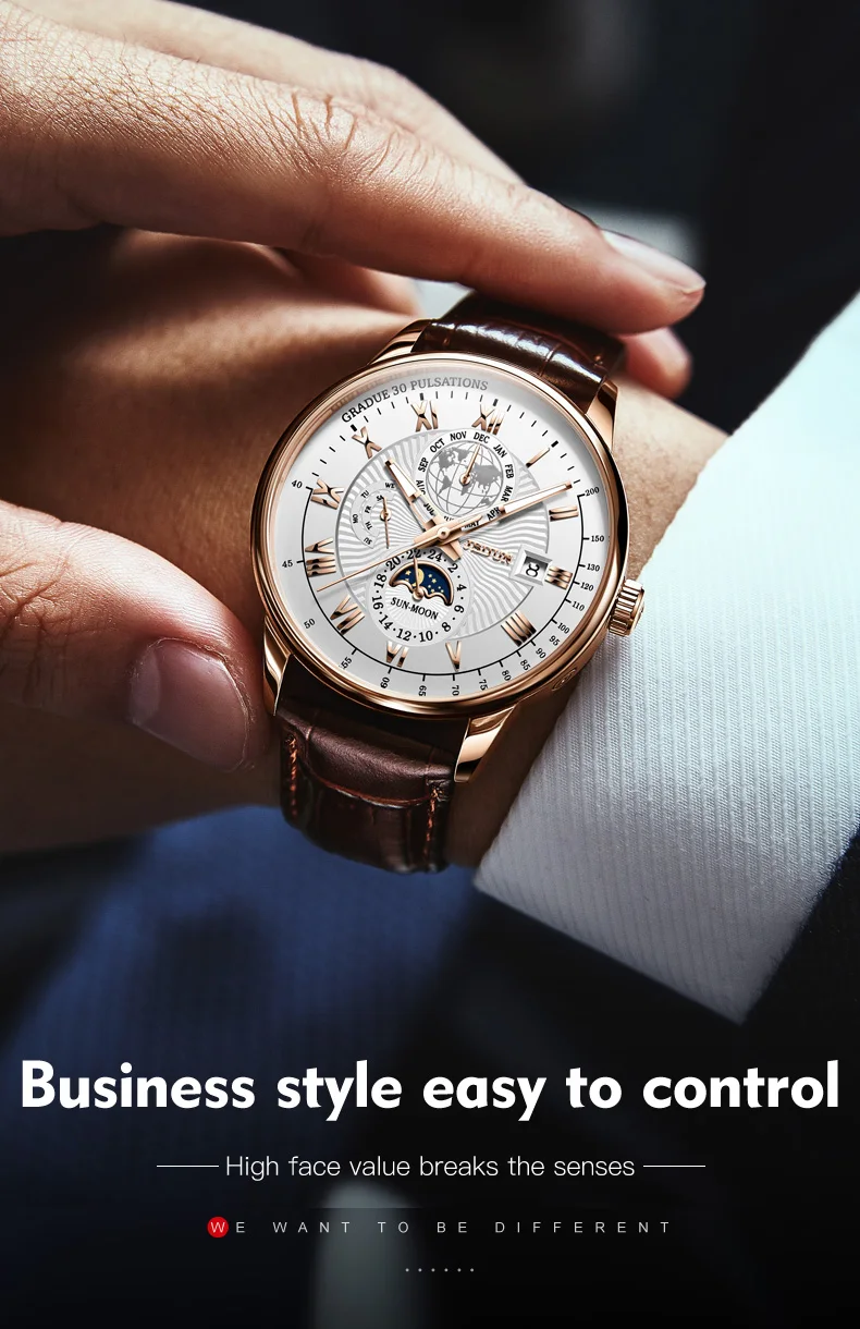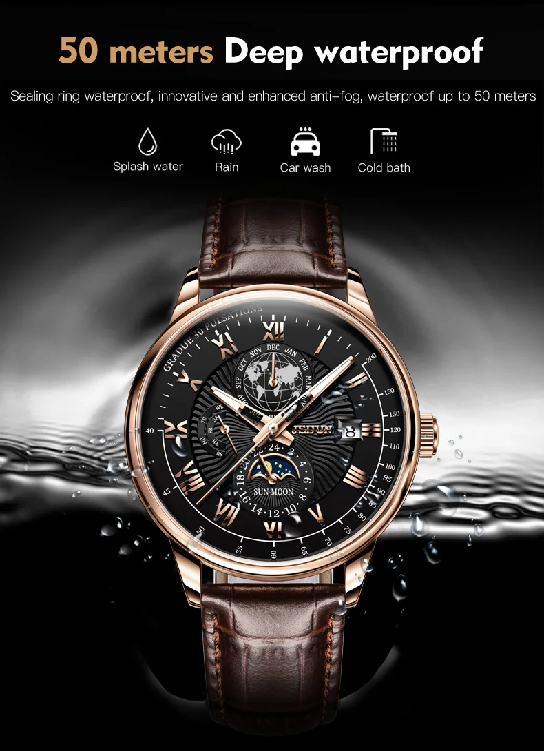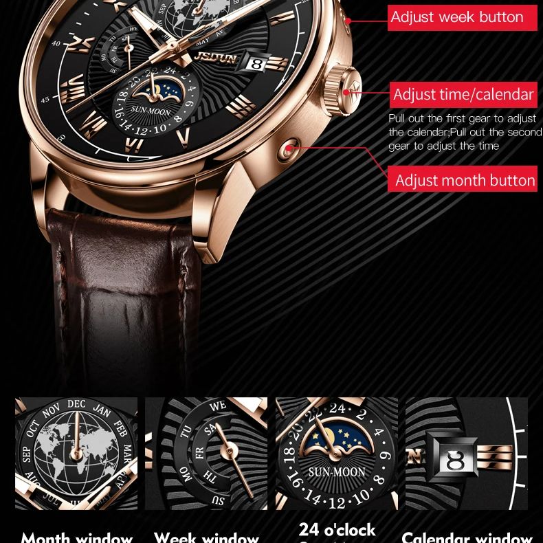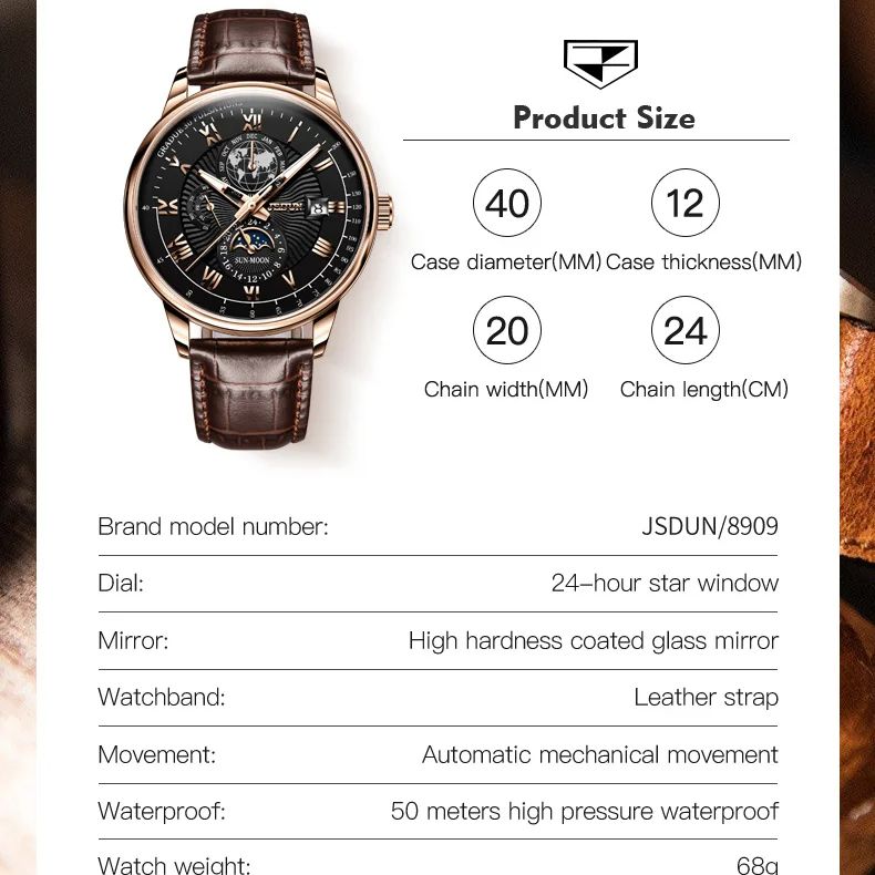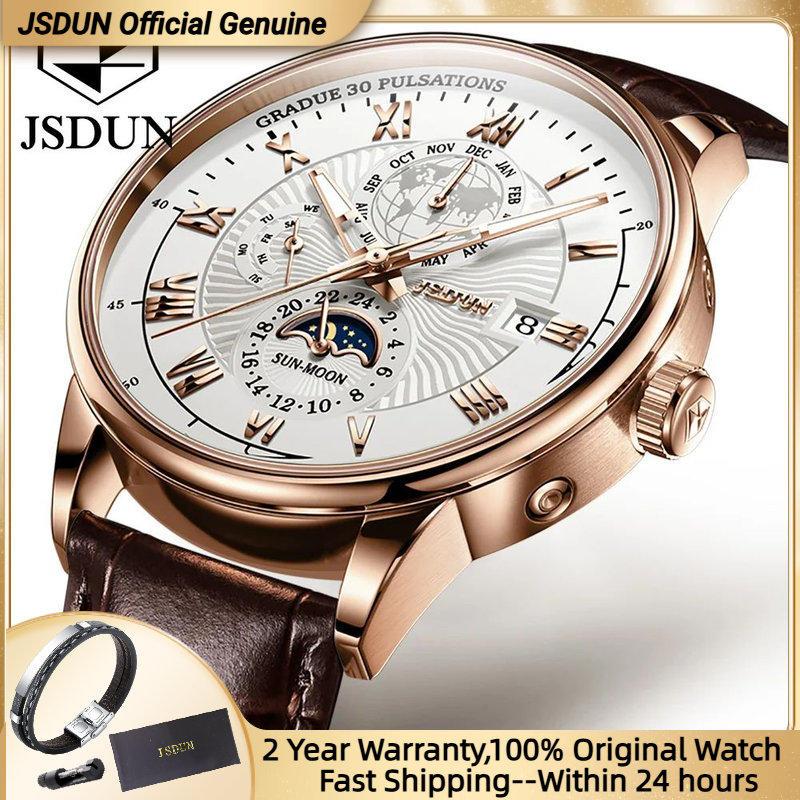 JSDUN 8909 Automatic Watch for Men Business Leather Watch Moon phase Multifunctional Waterproof Stainless steel Men's Watches