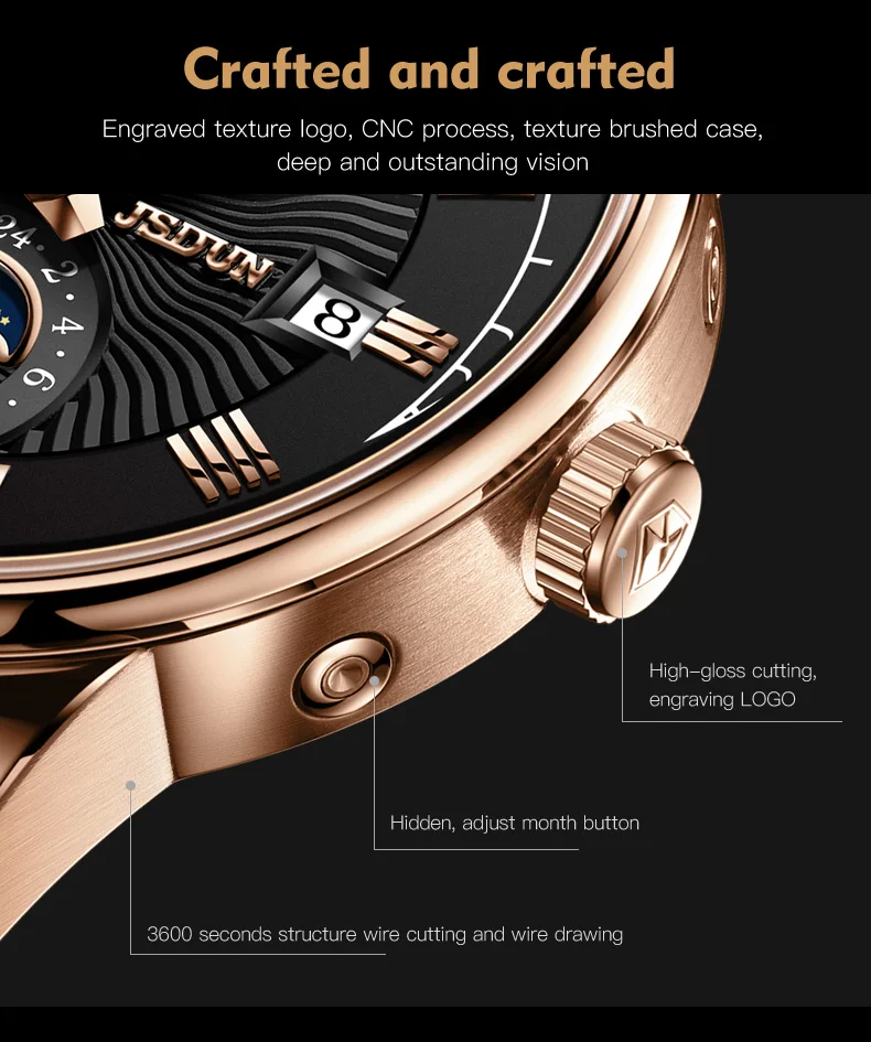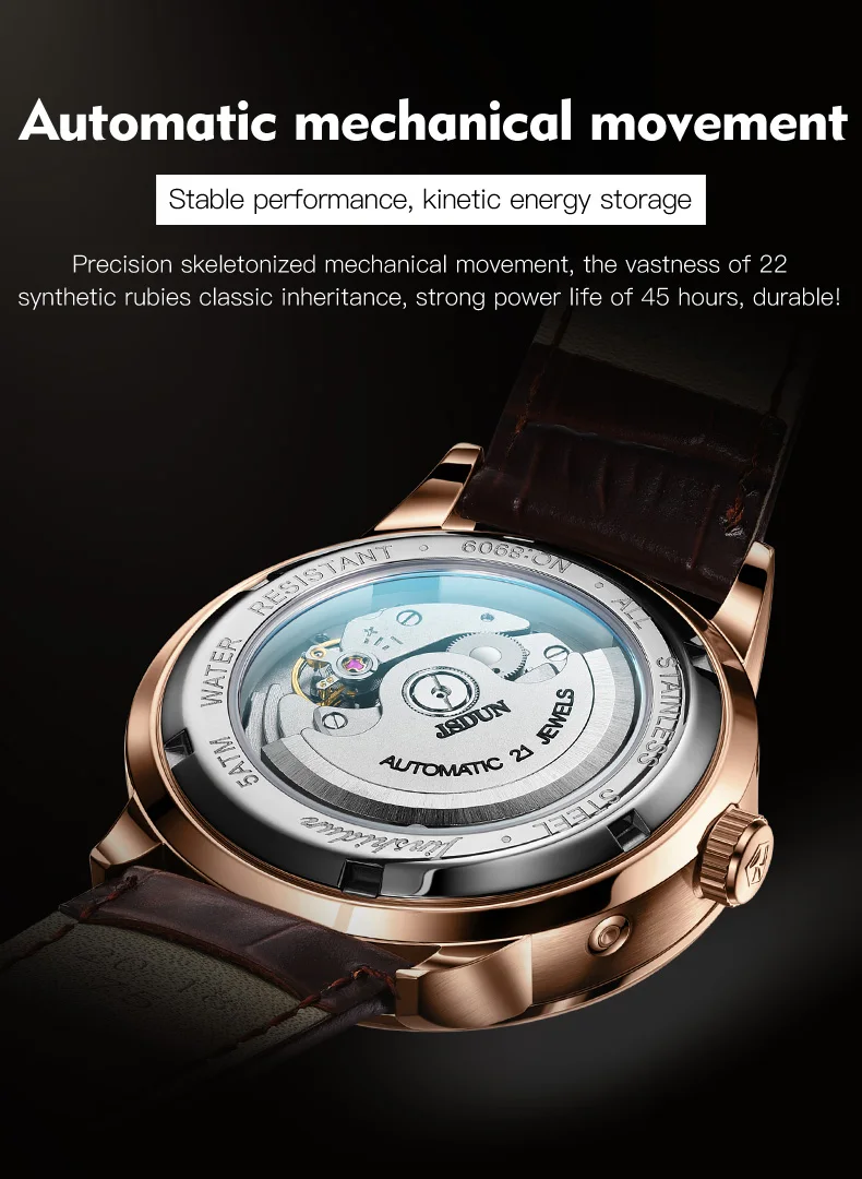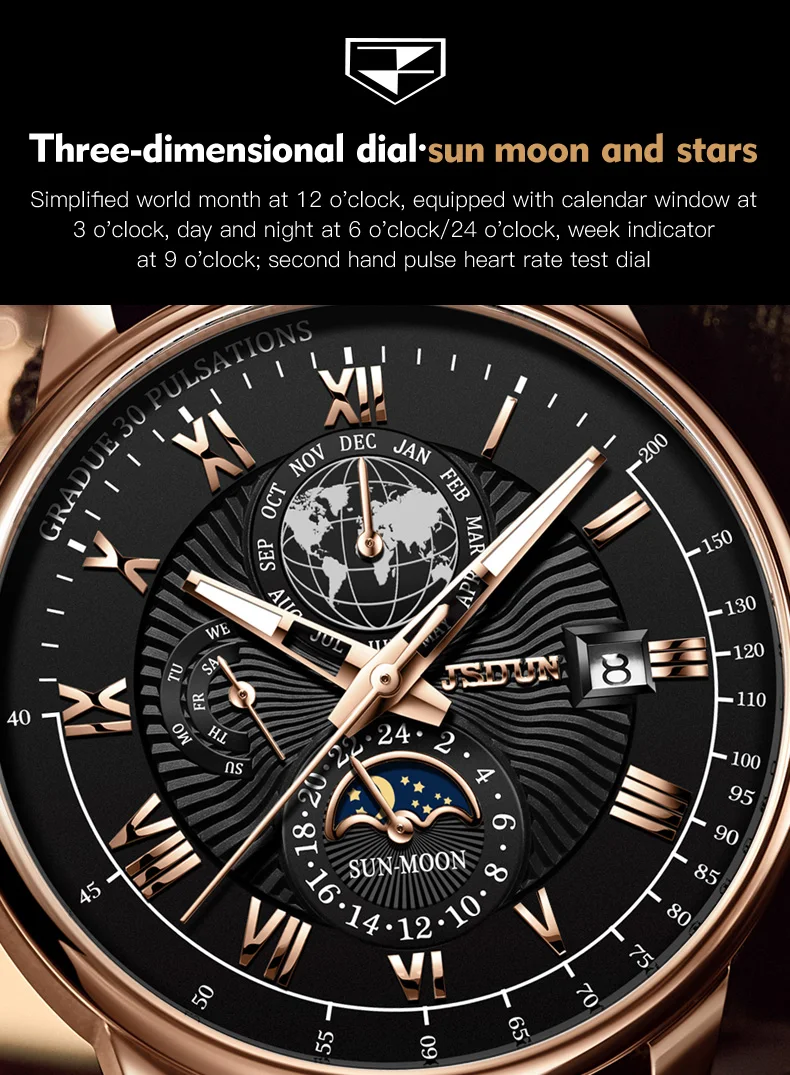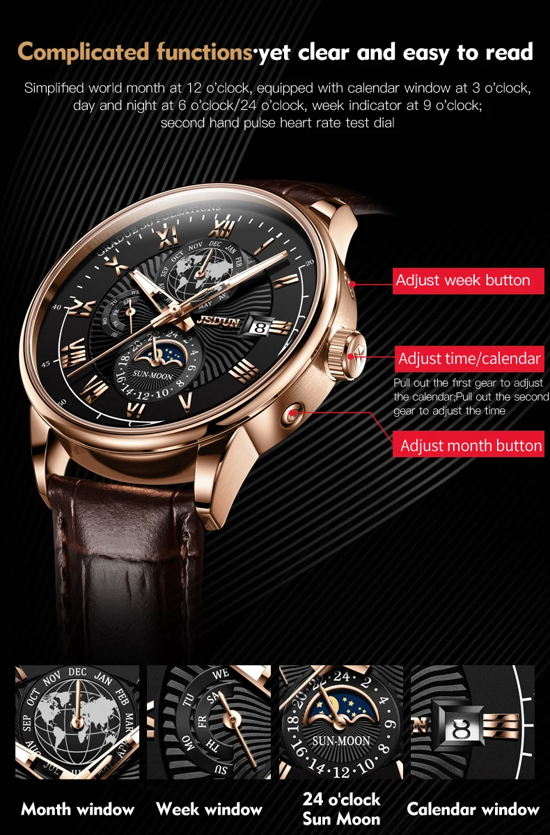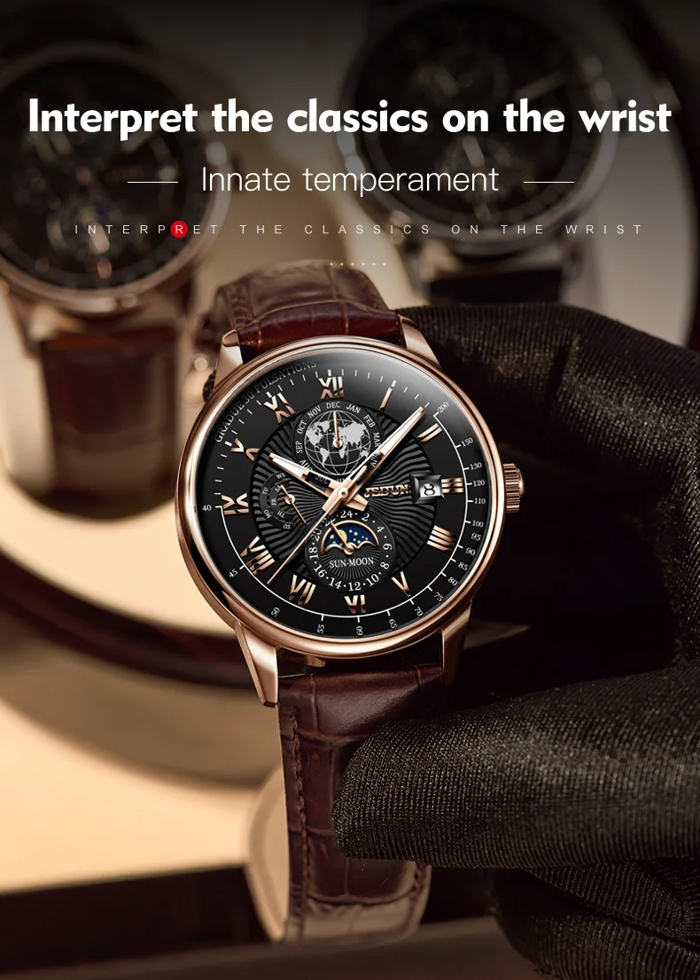 JSDUN 8909 Automatic Watch for Men Business Leather Watch Moon phase Multifunctional Waterproof Stainless steel Men's Watches