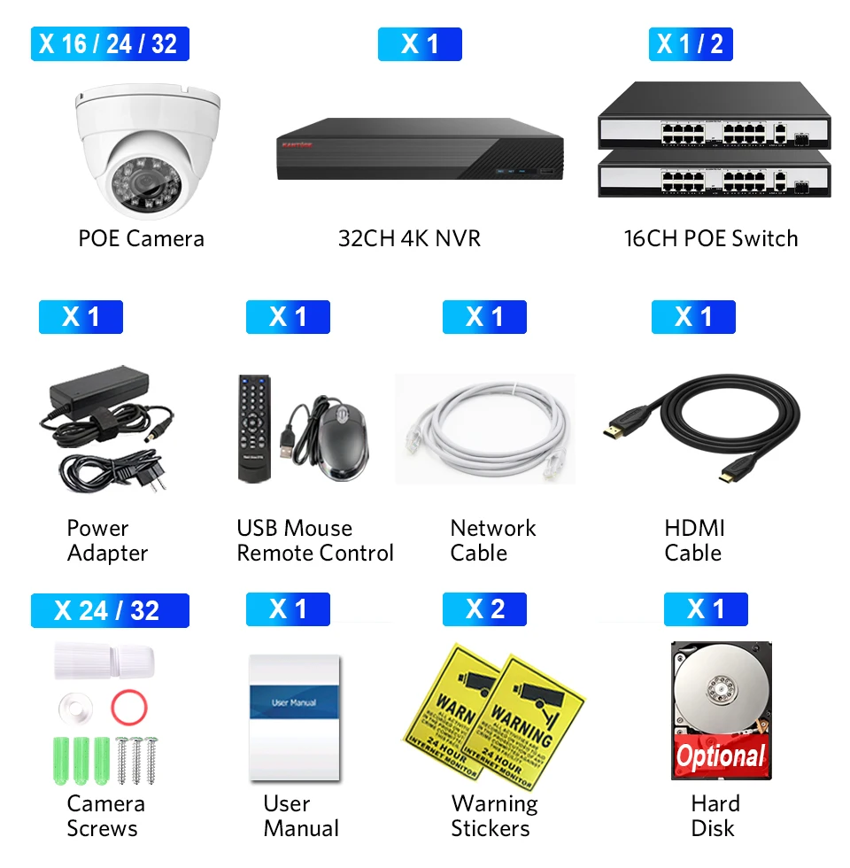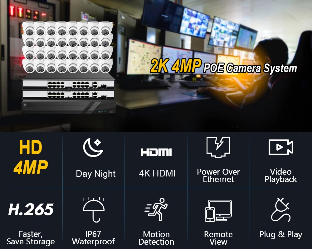 24/32*H.265 2K 4MP Day Night Waterproof Outdoor POE camera