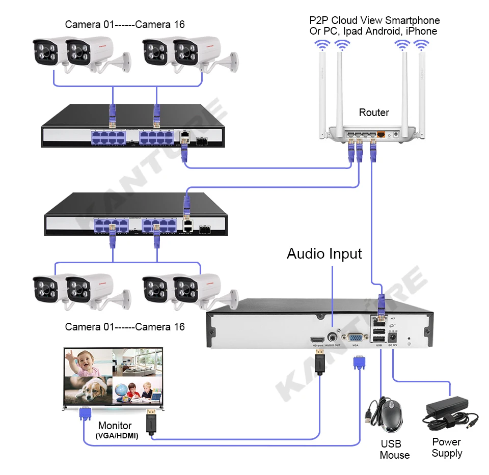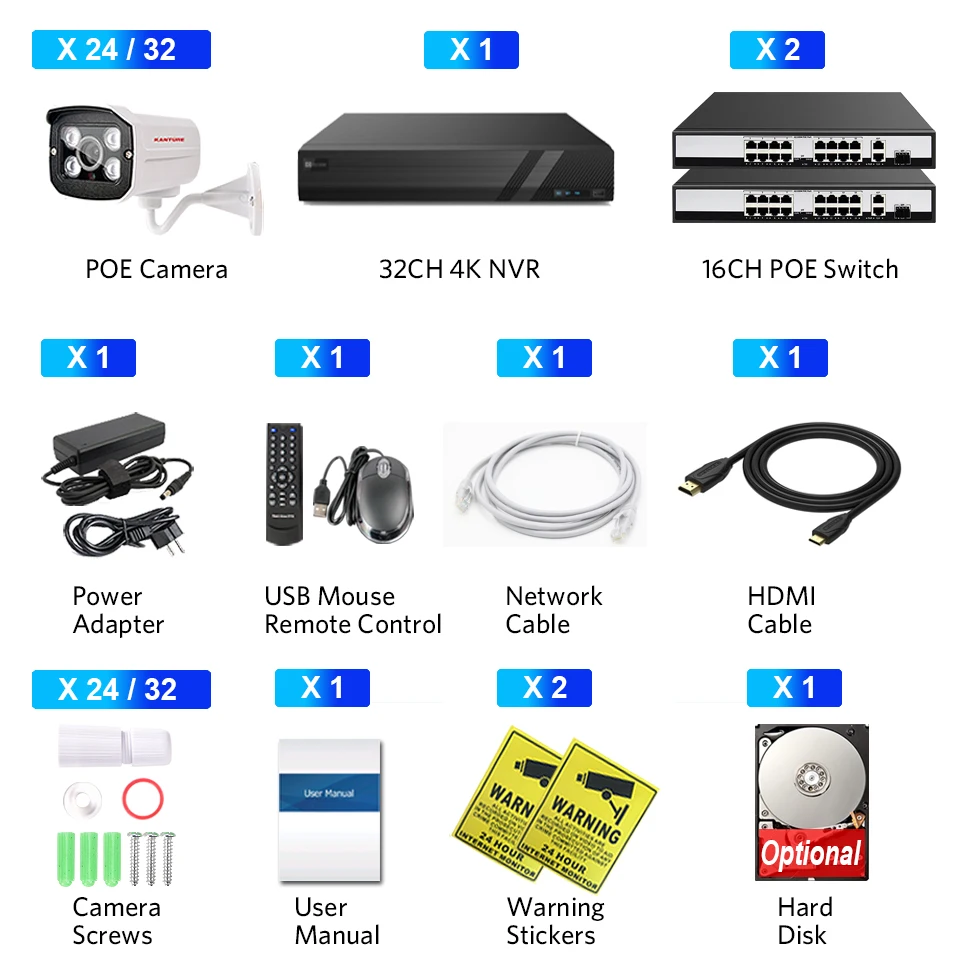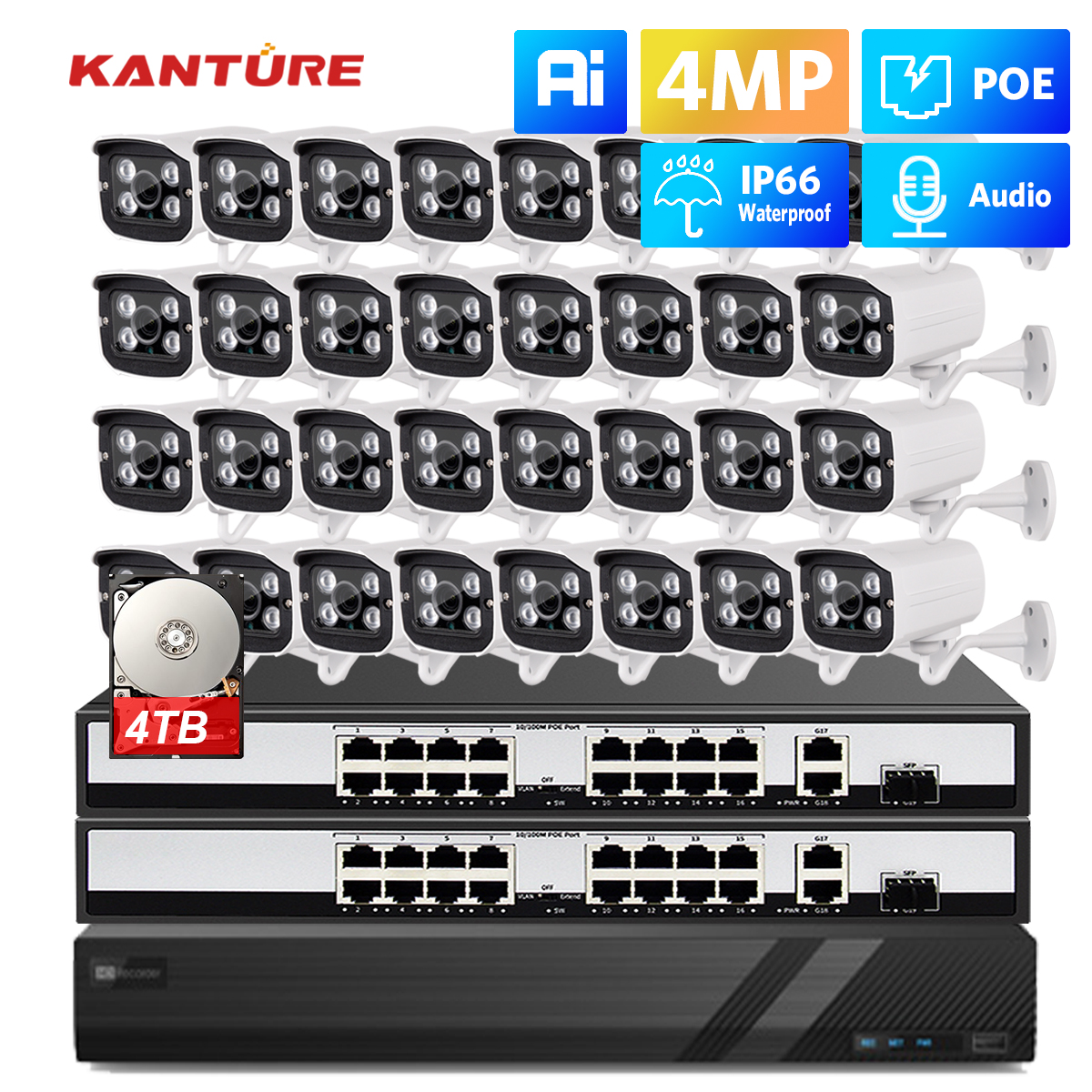 KANTURE H.265 32CH CCTV 4K HDMI NVR 4MP POE Security Camera System 4MP Audio Waterproof Outdoor 30M Night Vision Camera Kit
