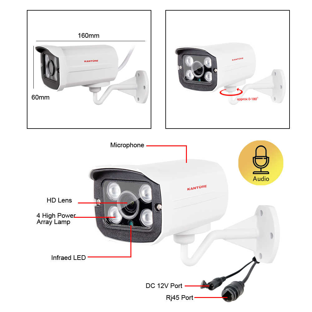 KANTURE surveillance camera has a solid aluminum body and housing,with an IP66 waterproof rating. So you can feel free to install it outdoor, like in your garage, backyard, or anywhere else. It can stand harsh weather conditions, including rain, snow, intense cold and heat(-40℃~50℃).