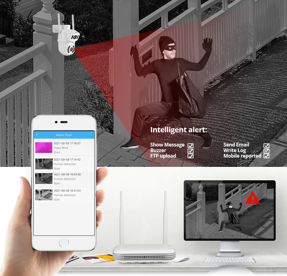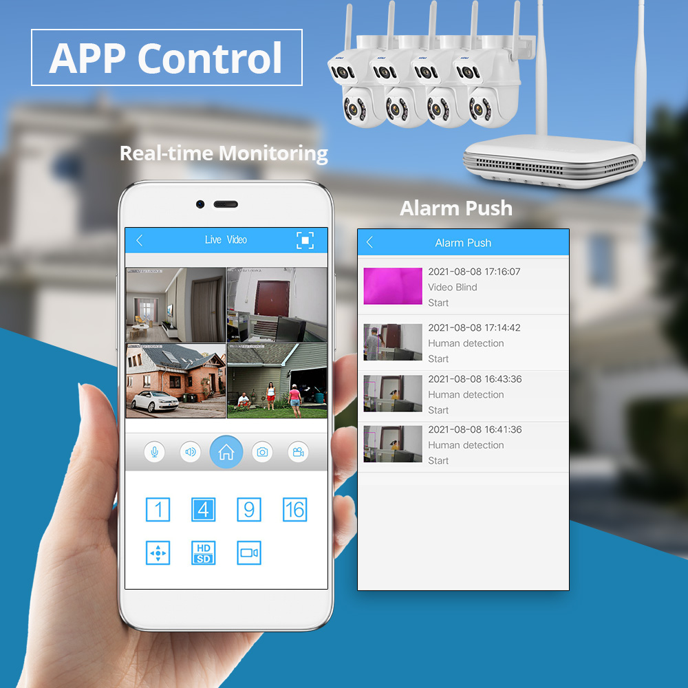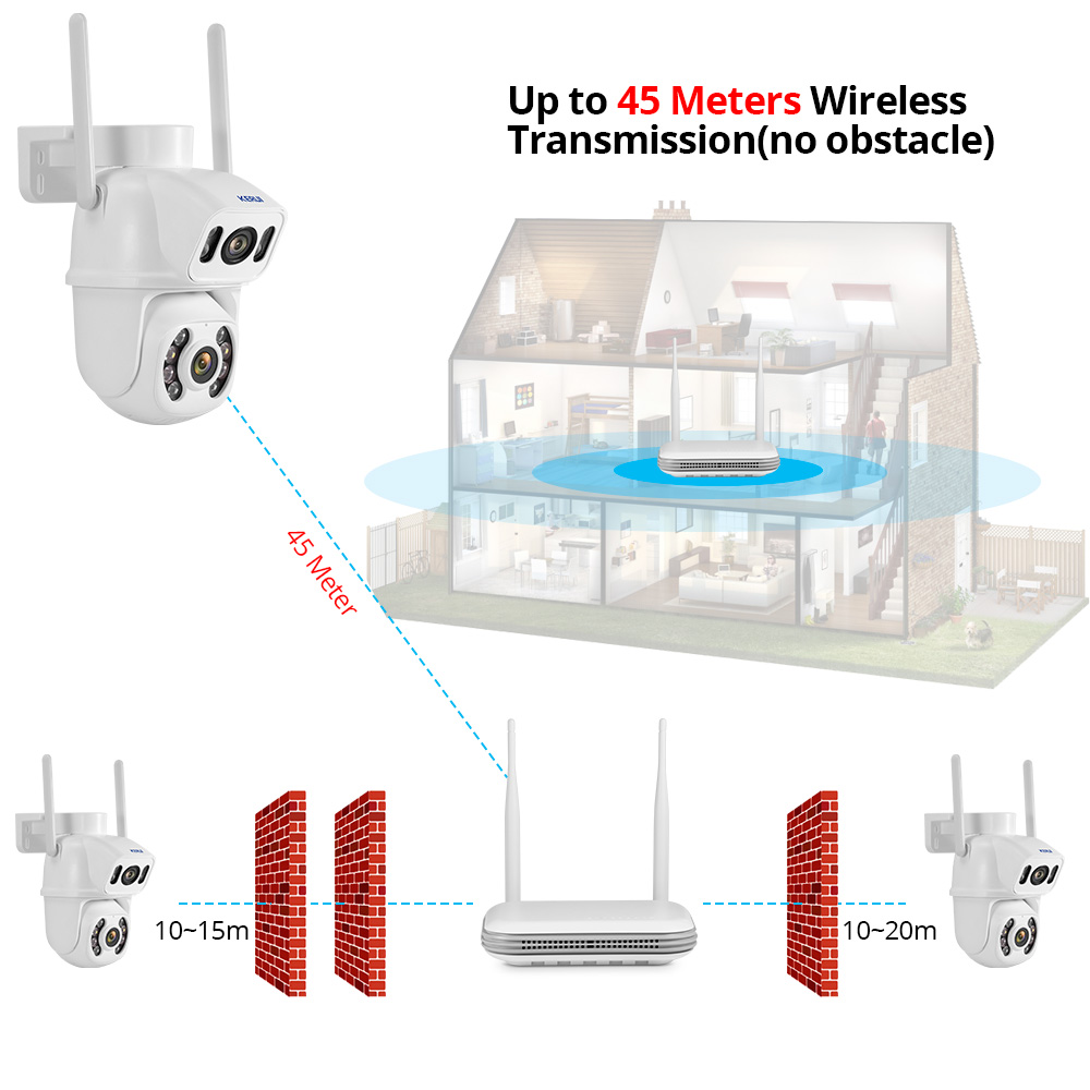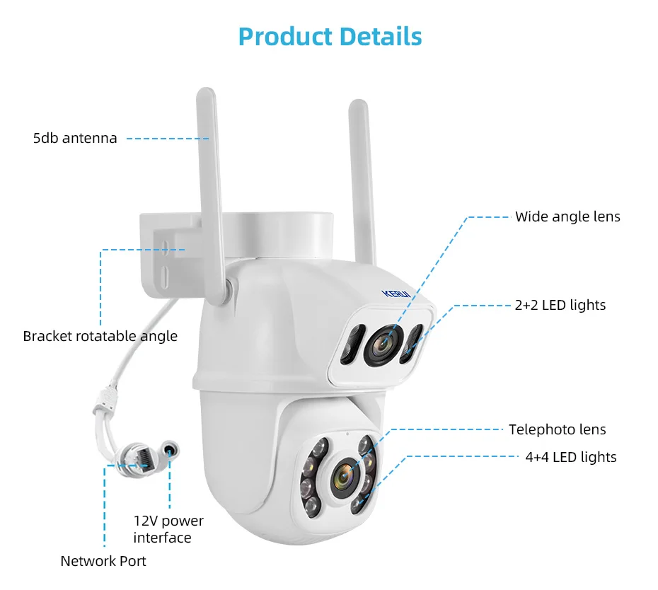 PTZ supports 1-8 camera connections, 3MP+3MP camera, HD night vision picture, auto-tracking, supports 50 meters of stable signal connection in open environment, WiFi chip with excellent performance through the wall, strong anti-interference