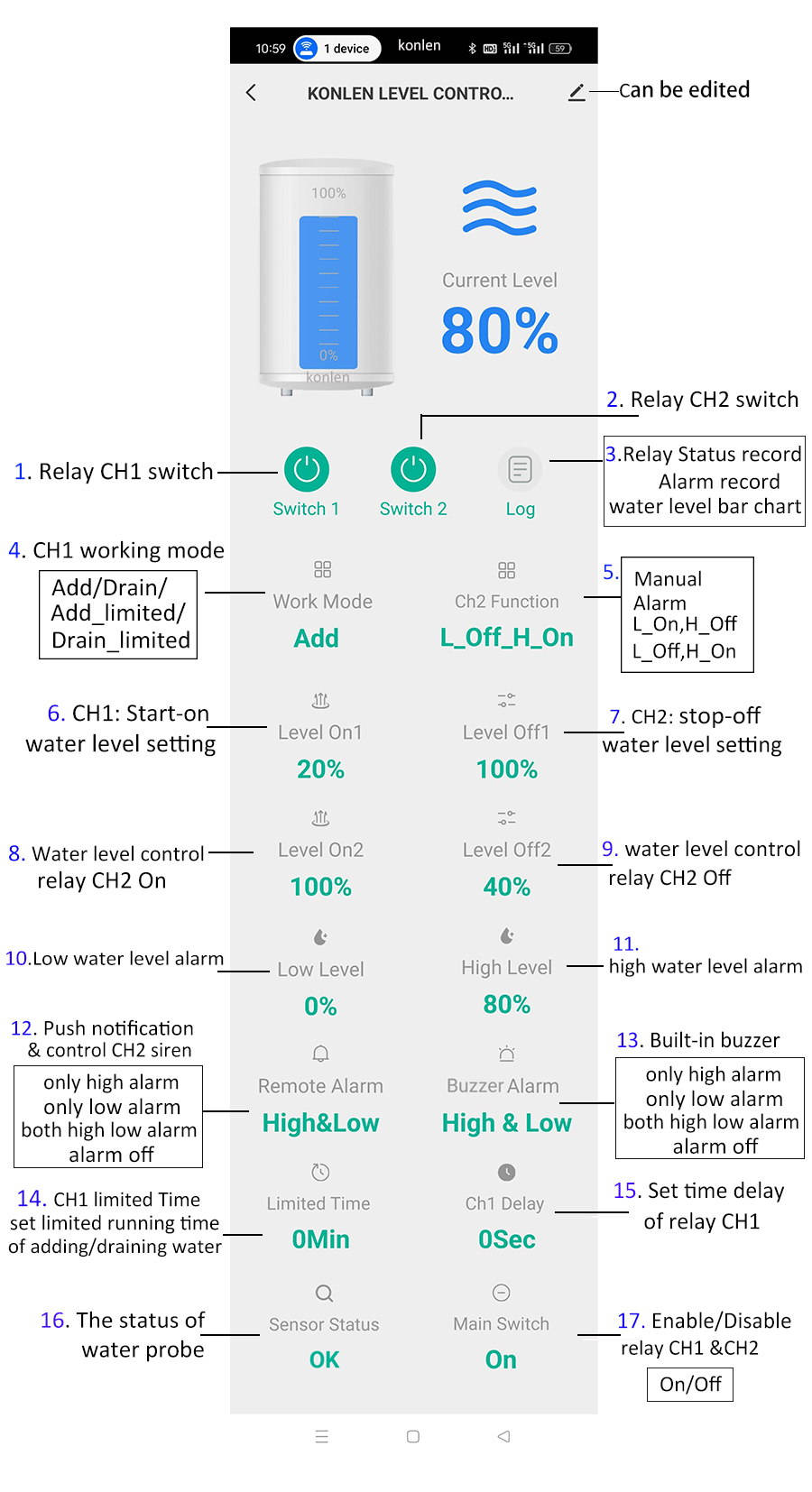 3. In app, the No.2, 5, 8, 9 are for relay switch CH2 control and setting. CH2 has 4 function options (Manual, Alarm, L_On, H_Off, L_Off, H_On, so it is supplementary function options of CH1.