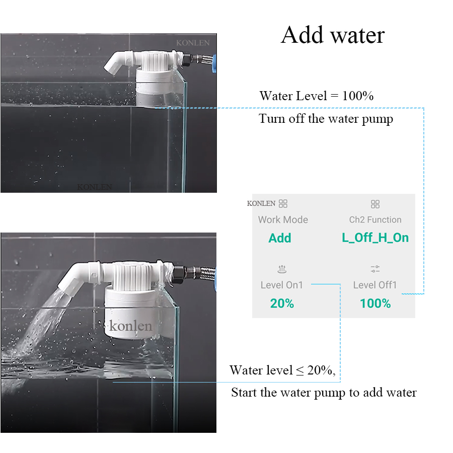 It is a KONLEN WIFI intelligent water level controller, which can be set by Tuya smart or Smart life App to realize water level monitoring, water supplement or drainage, high and low water level remote APP push alarm notification, built-in buzzer or external siren local alarm, inquiry history record etc.
