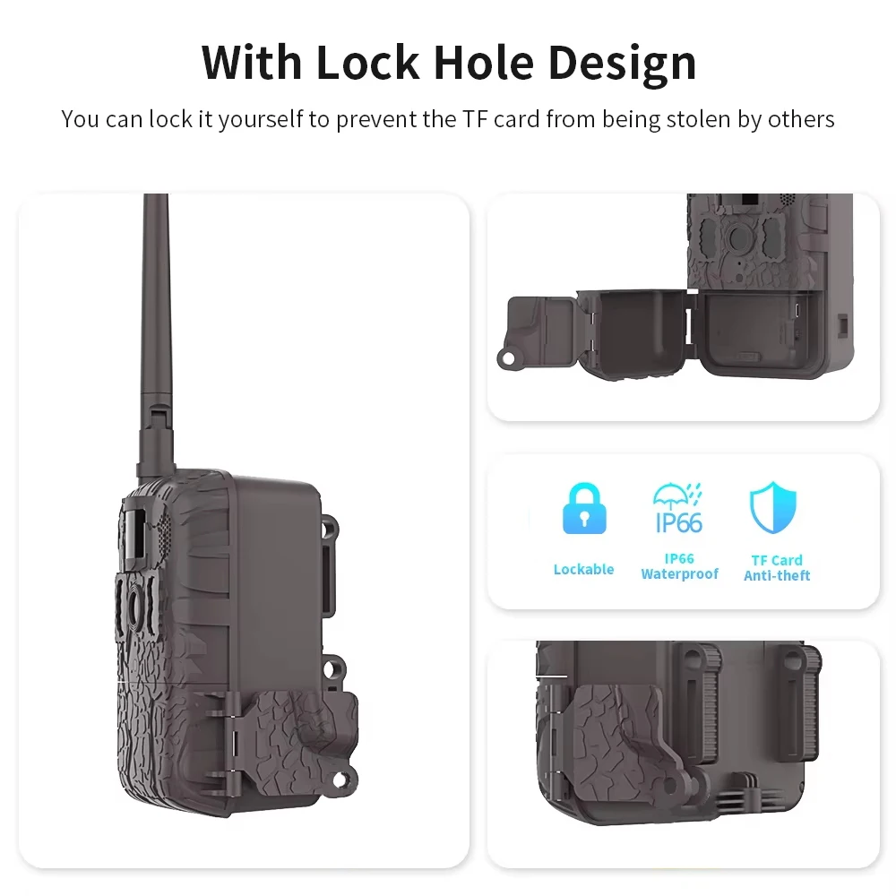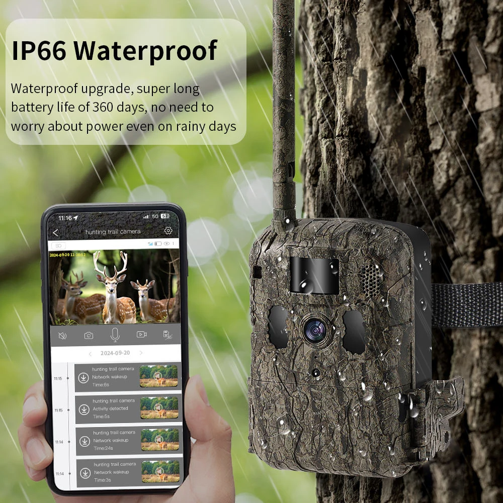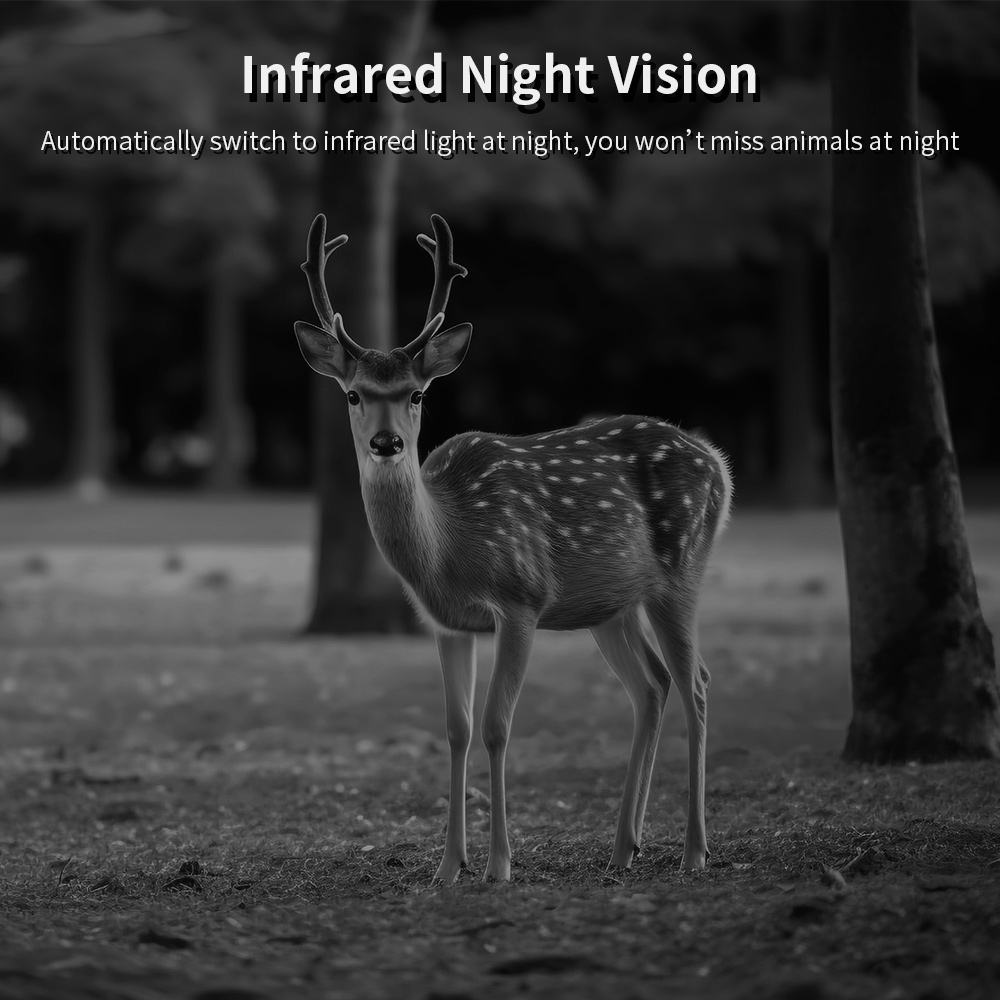 【 940nm No-Glow Night Vision & IP66 waterproof】This upgraded Hunting & Trail Camera with 940nm infrared night vision delivers clear images of wildlife in low light (night vision range of up to 65ft), without emitting glaring lights that might disturb animals.The 4G Hunting Camera can capture every critical moment clearly, day or night. (Does not support automatic tracking of moving objects.) With an IP66 waterproof rating, they are designed to withstand diverse environments, ensuring their long-lasting performance. Provide an ideal solution for outdoor use.