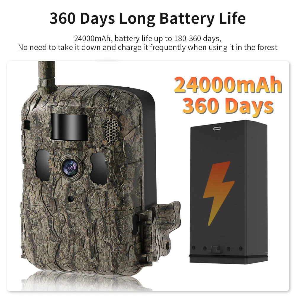 【24000mAh Rechargeable Battery & Efficient Solar Power】 Trail Camera Equipped with customized large rechargeable battery 24000mah(Normal use time about 3-4 months,Standby about 6-8months according to use situation) , enabling extended outdoor recording without frequent battery replacements. This saves costs and minimizes environmental impact. Featuring a 3W trail camera solar panel plus 24000mAh rechargeable battery, these solar powered trail camera guarantee a constant power supply, eliminating the hassle of frequent takedowns and charging. No need to charge for 365 days.