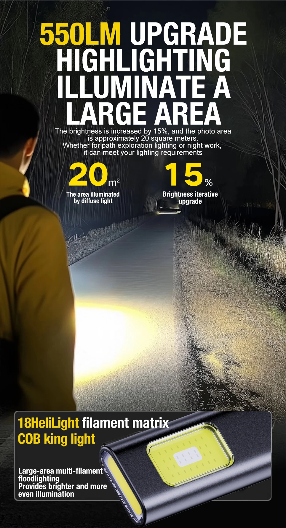 4. Boasting 550 lumens brightness and 20㎡ floodlight coverage, this flashlight casts wide, clear light to light up large areasgreat for night walks, camping setups, or working in dim spaces. The floodlight design ensures no dark corners, providing reliable visibility whenever you need it.