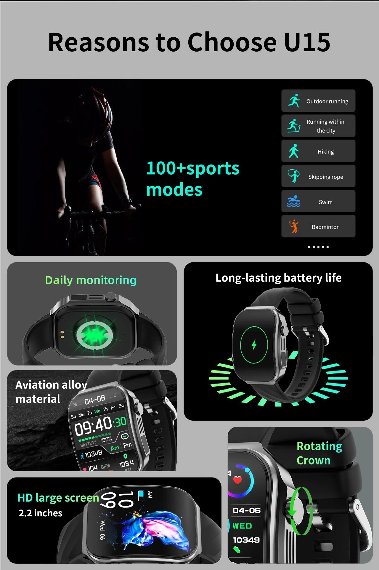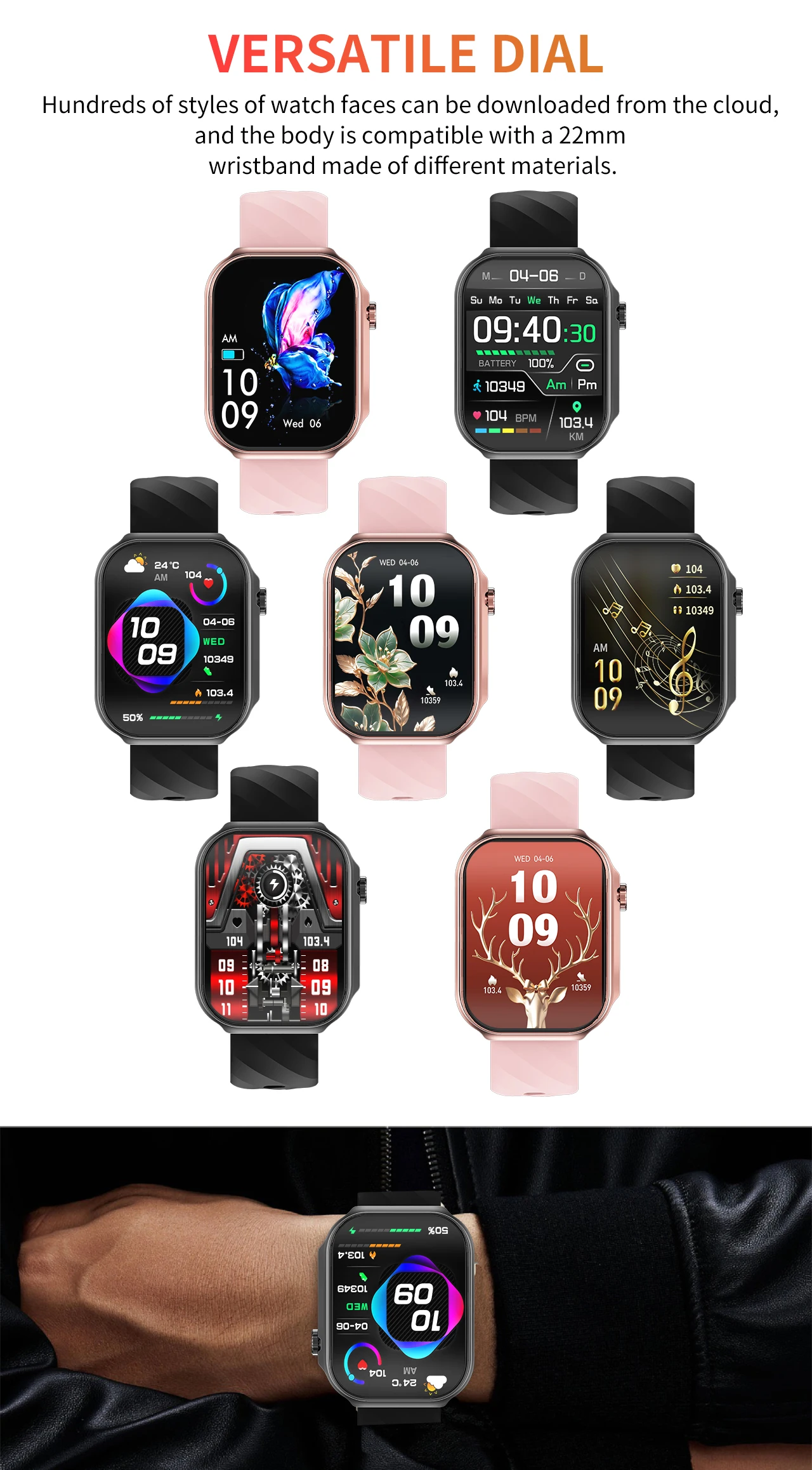 All-weather heart rate, blood oxygen, body temperature, calls, step counting, sleep, calories, distance, voice assistant, wearable detection SOS, siren Music playback, stopwatch, countdown, calculator, weather display, female menstrual cycle function, remote photo taking, raising the wrist to light up the screen, finding mobile phones, incoming call reminder (caller number/name), message reminder, alarm clock reminder, sedentary reminder, heart rate function alarm reminder, Bluetooth disconnection reminder (requires APP to be opened), games, flashlight, breathing training, language settings, time and date settings, multiple dials: 8 default dials + 1 custom dial + 1 massive dial, 100+ sports modes
