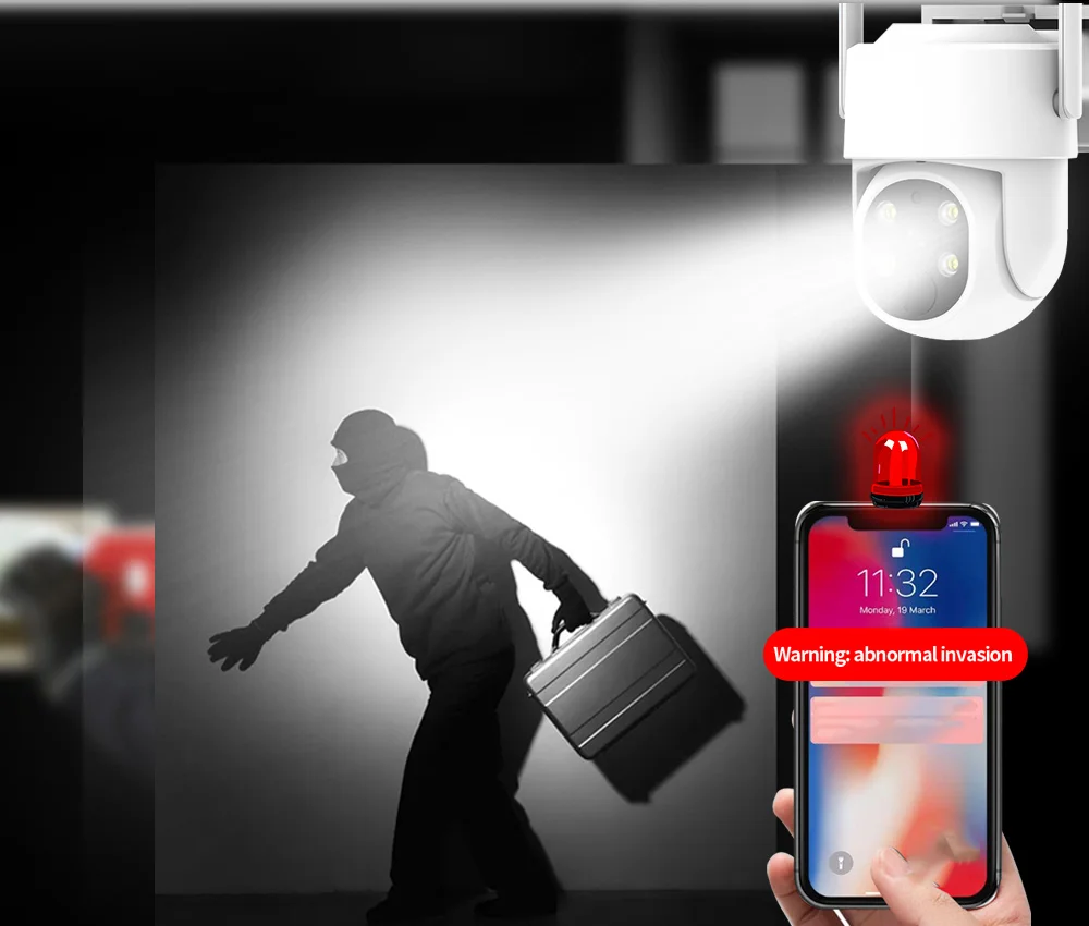 When someone breaks into shooting area, the camera will make alarm sound and alarm message will be pushed to your Phone APP. And when it motion detect, 4 white LED lights will light up, showing you the color night scene.