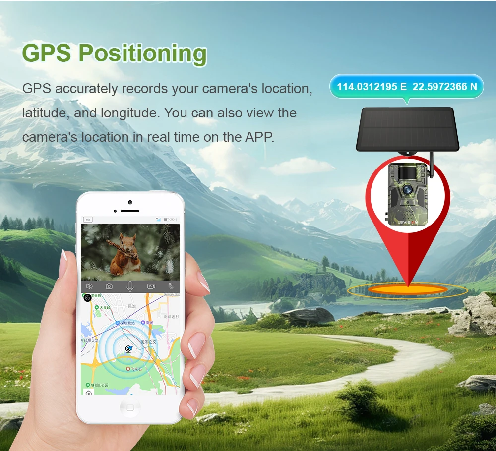 * GPS accurately records your camera's location,latutde and logitude. You can also view the camera's location in real tiem on the APP.