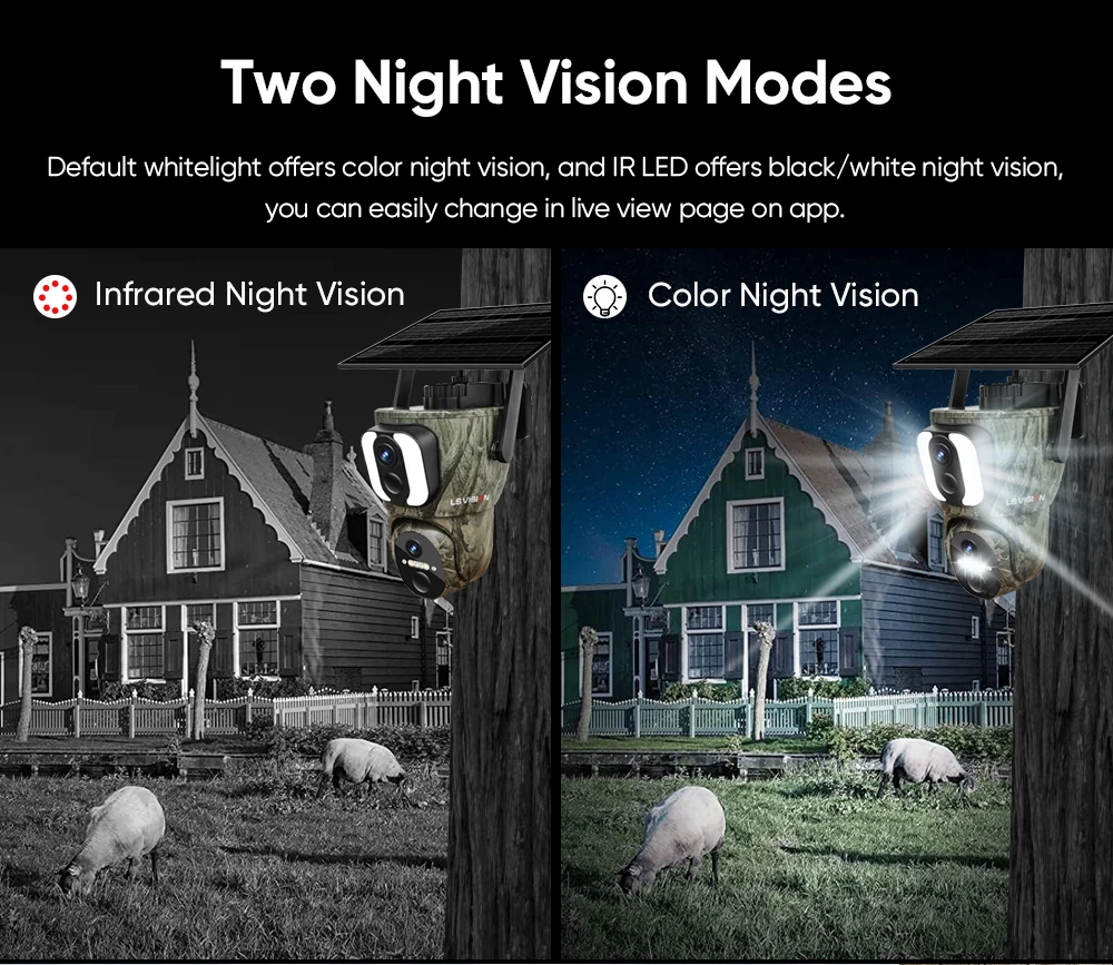 Default whitelight offers color night vision, and IR LED offers black/white night vision,you can easily change in live view page on app.