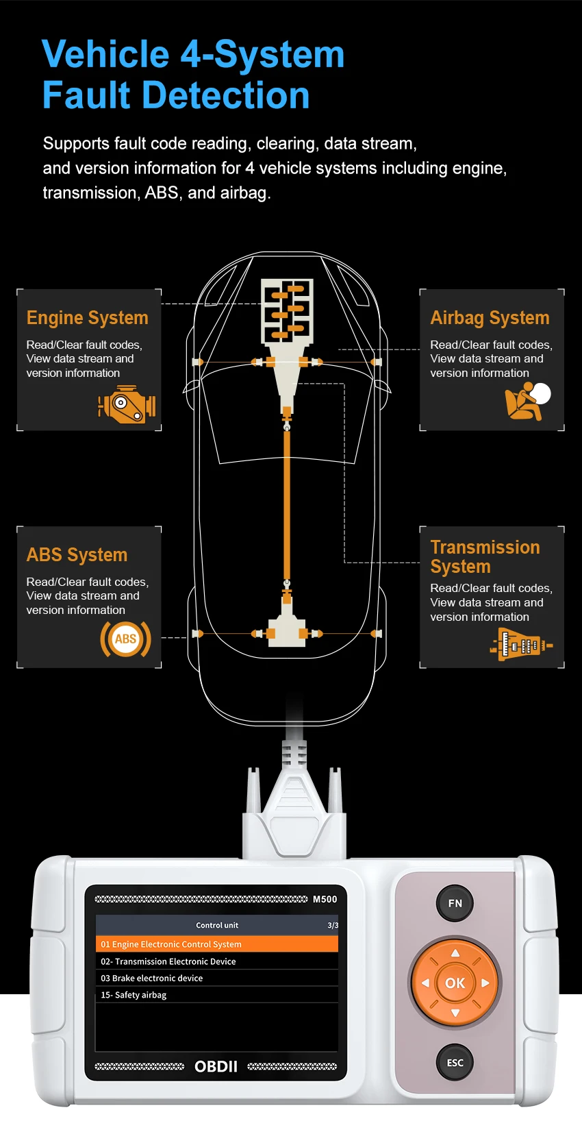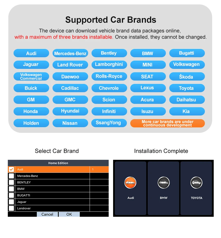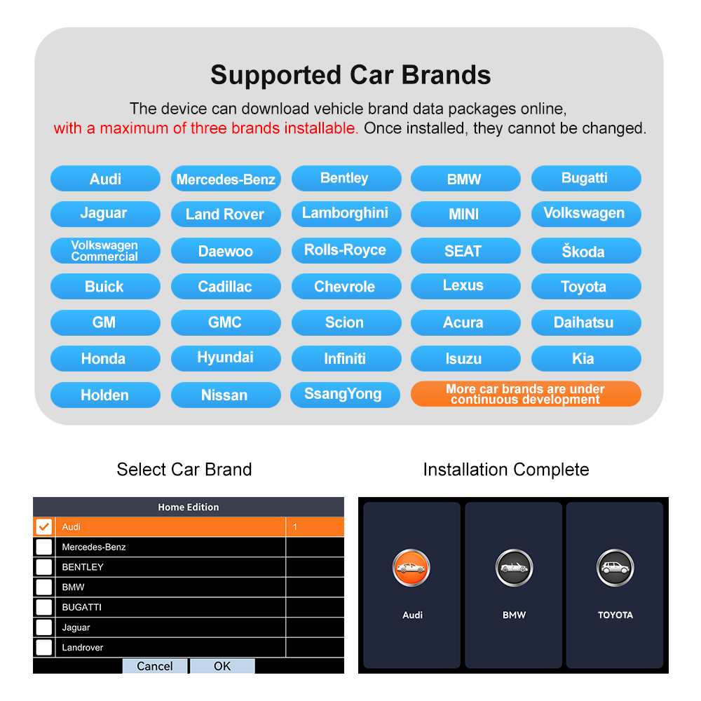 ● Full vehicle diagnosis (choose any 3 car brands from the 33 models on the product page; after receiving the product, the customer can select the model for download according to the manual)