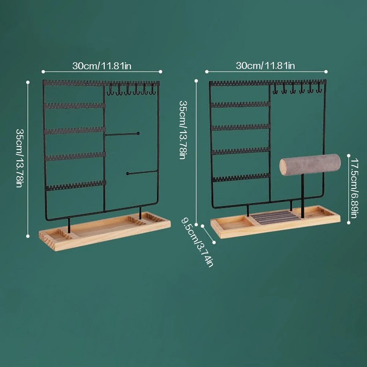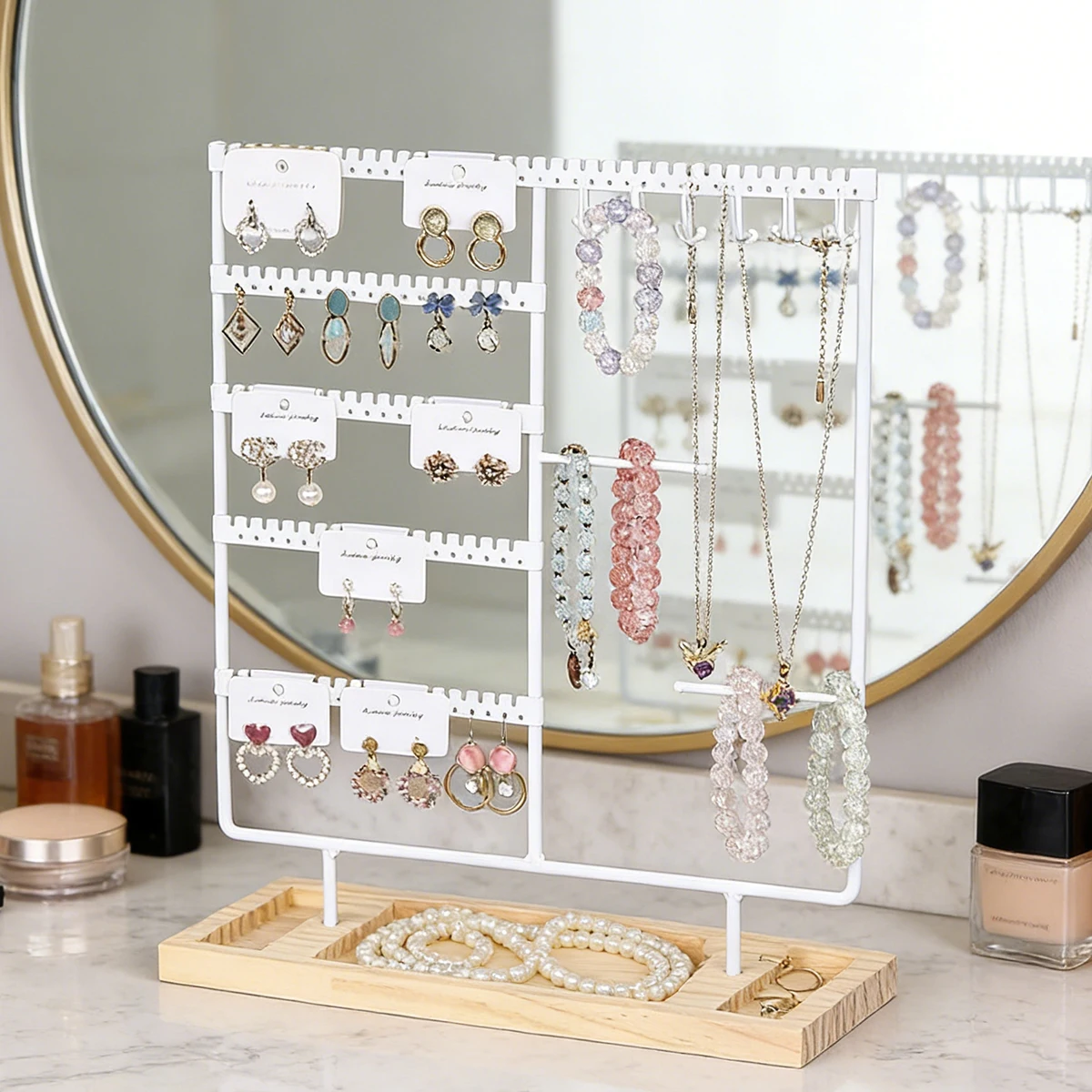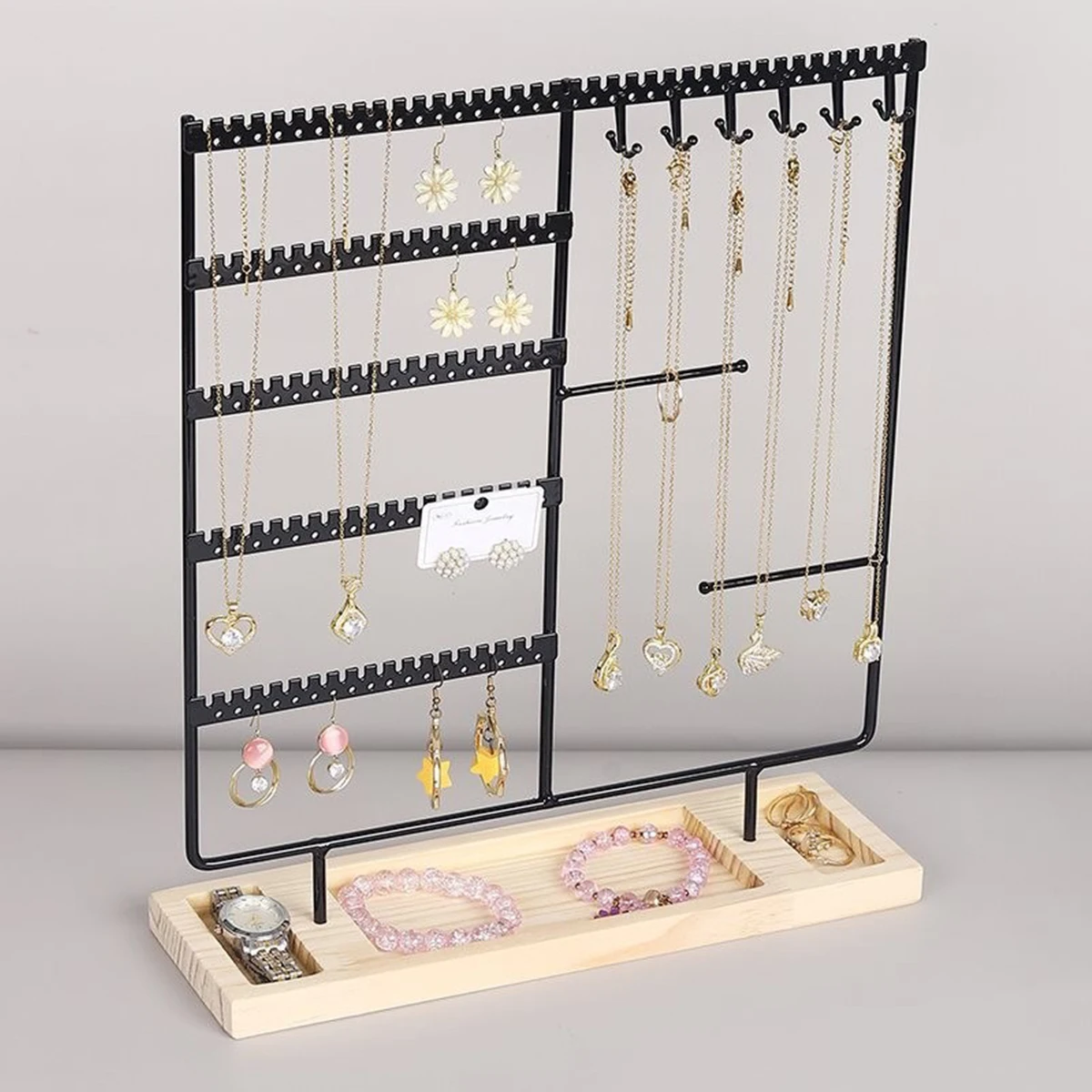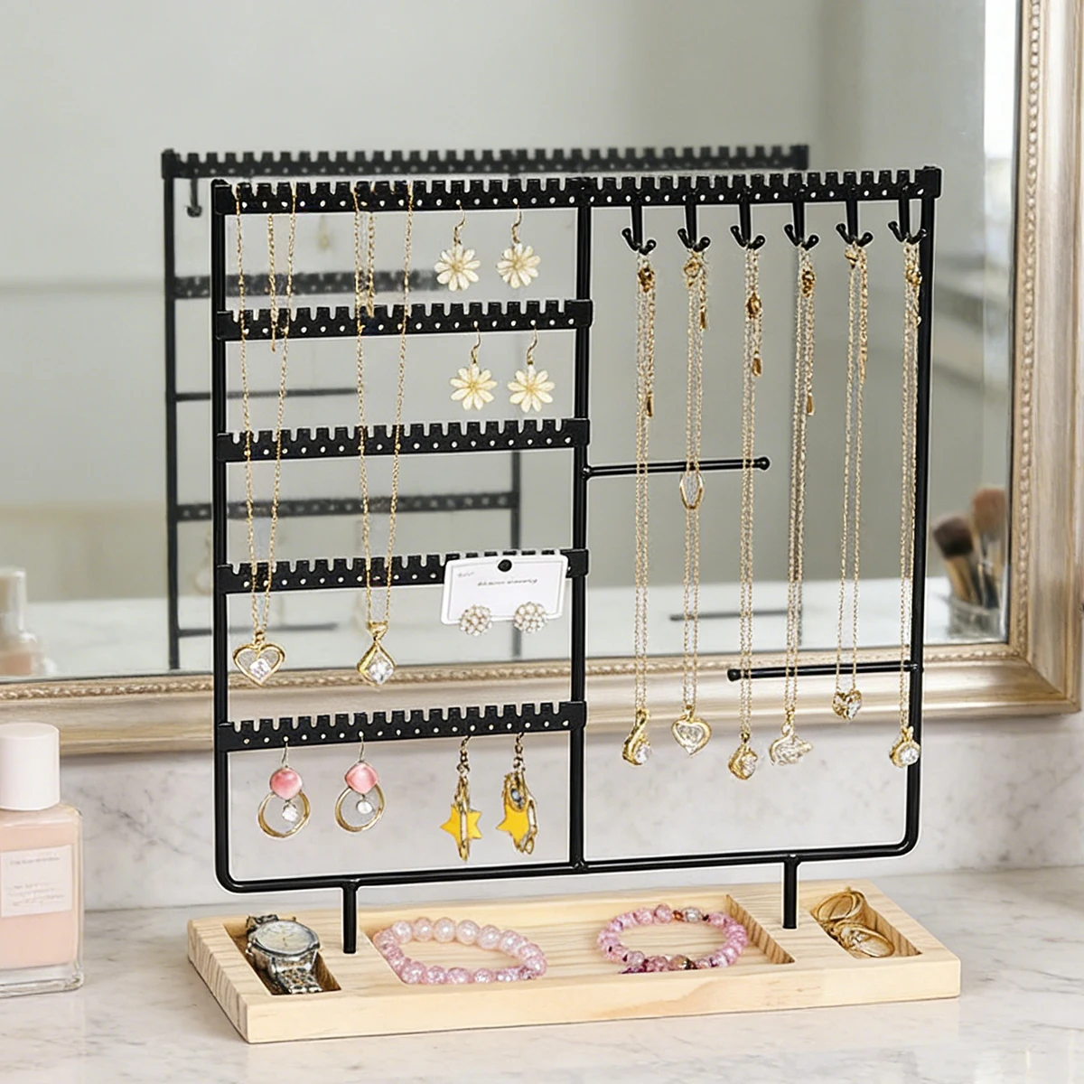 Metal Jewelry Organizer Stand with Wooden Tray – Multi-Functional Storage for Earrings, Necklaces, Bracelets & Rings