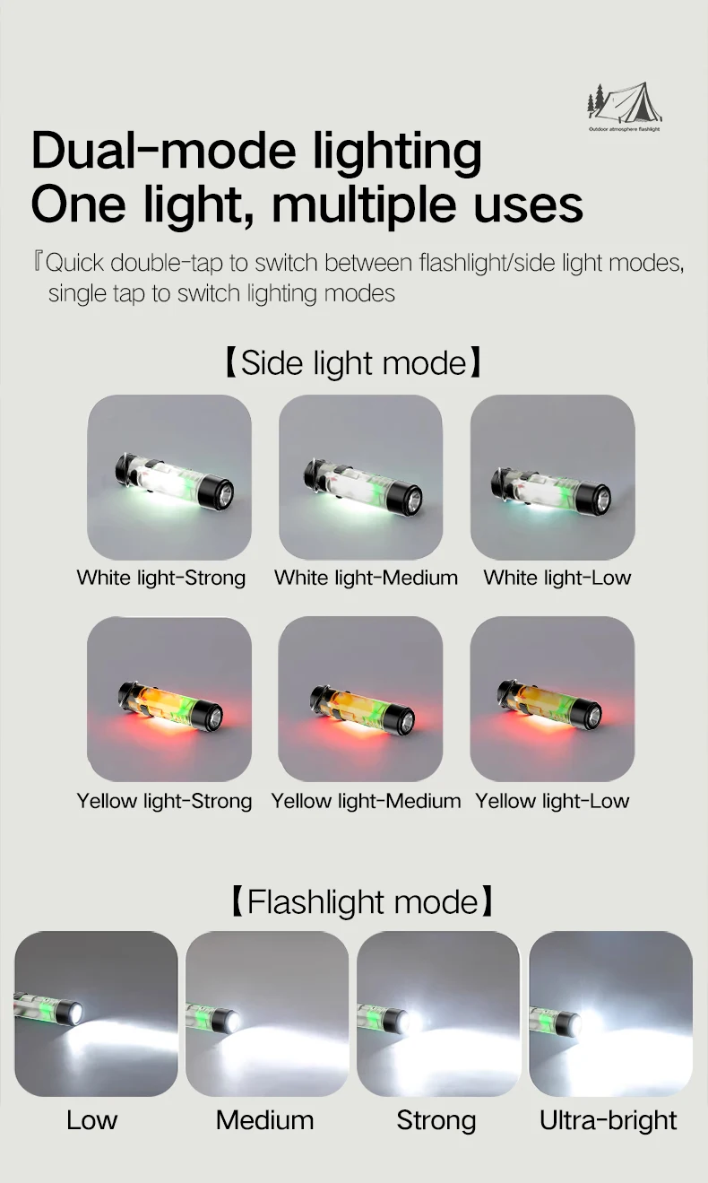 Double click the switch to switch between the main light and side lights, long press the switch to directly turn on the strong light mode of the main light
