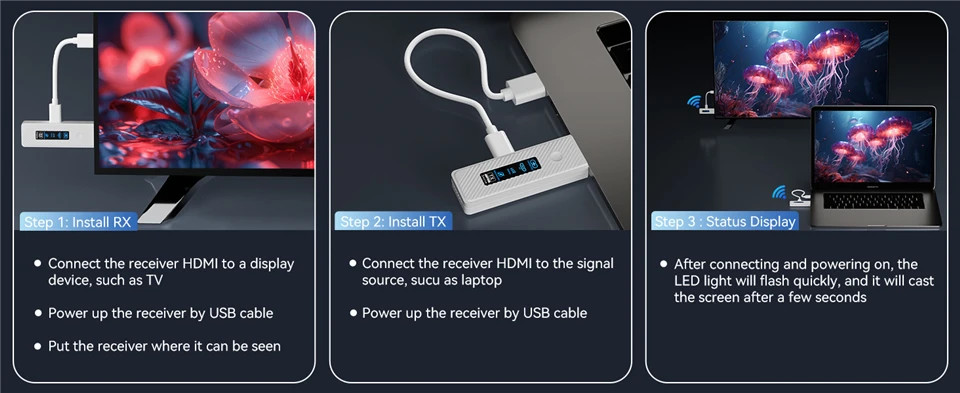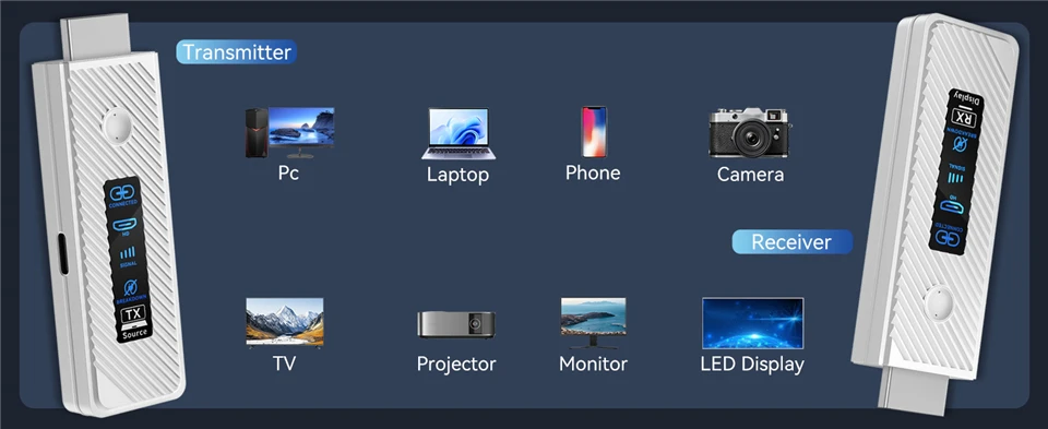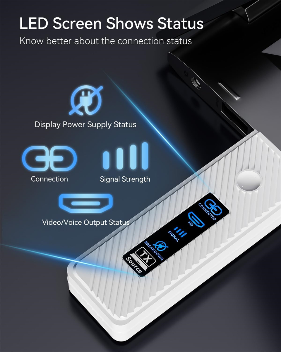 • 【LED Display & Travel-Friendly】With LED digital display, you can know the connection status & signal strength in real time. Easier to solve connection issues. Wireless HDMI sender extender in a compact and lightweight design. Perfect for business trips, business meeting presentations, vacations or family gatherings