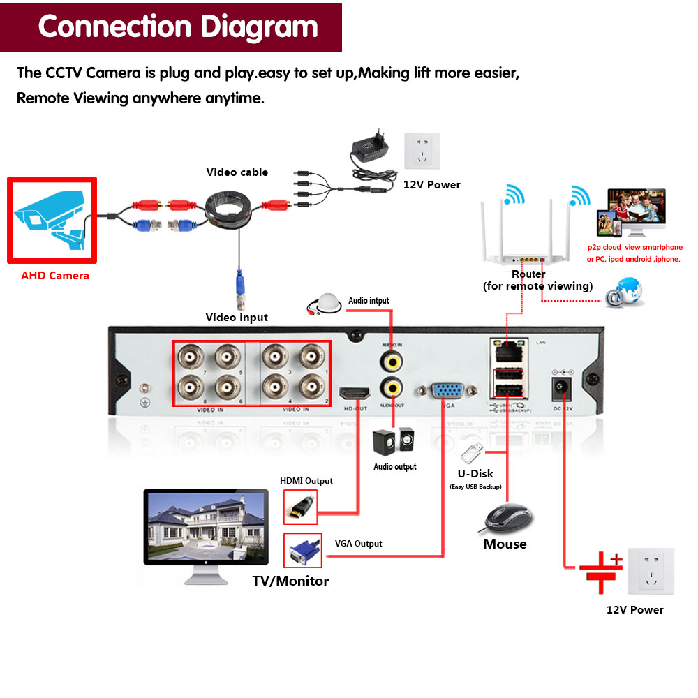 The cctv security camera is plug and play ,easy to set up,Making lift more easier.Remote viewing anywhere anytime.