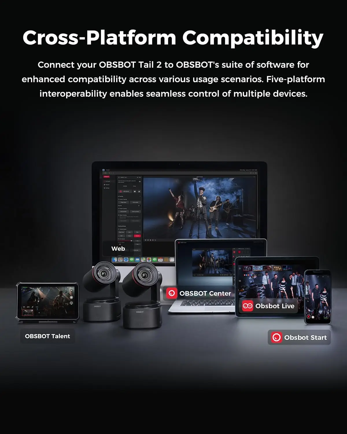 OBSBOT provides a software suite to control the Tail 2, including Obsbot Start console software, Obsbot Live for multicamera streaming, and Obsbot Center for compatibility and control of all OBSBOT devices.