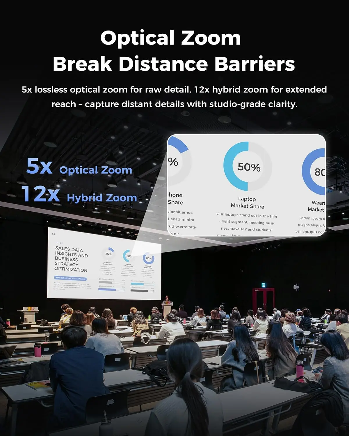 With 5x optical zoom and 12x hybrid zoom, this camera excels at capturing distant subjects. Even objects far away appear sharp and detailed, as if they were right in front of you, pushing the boundaries of long-distance videography.