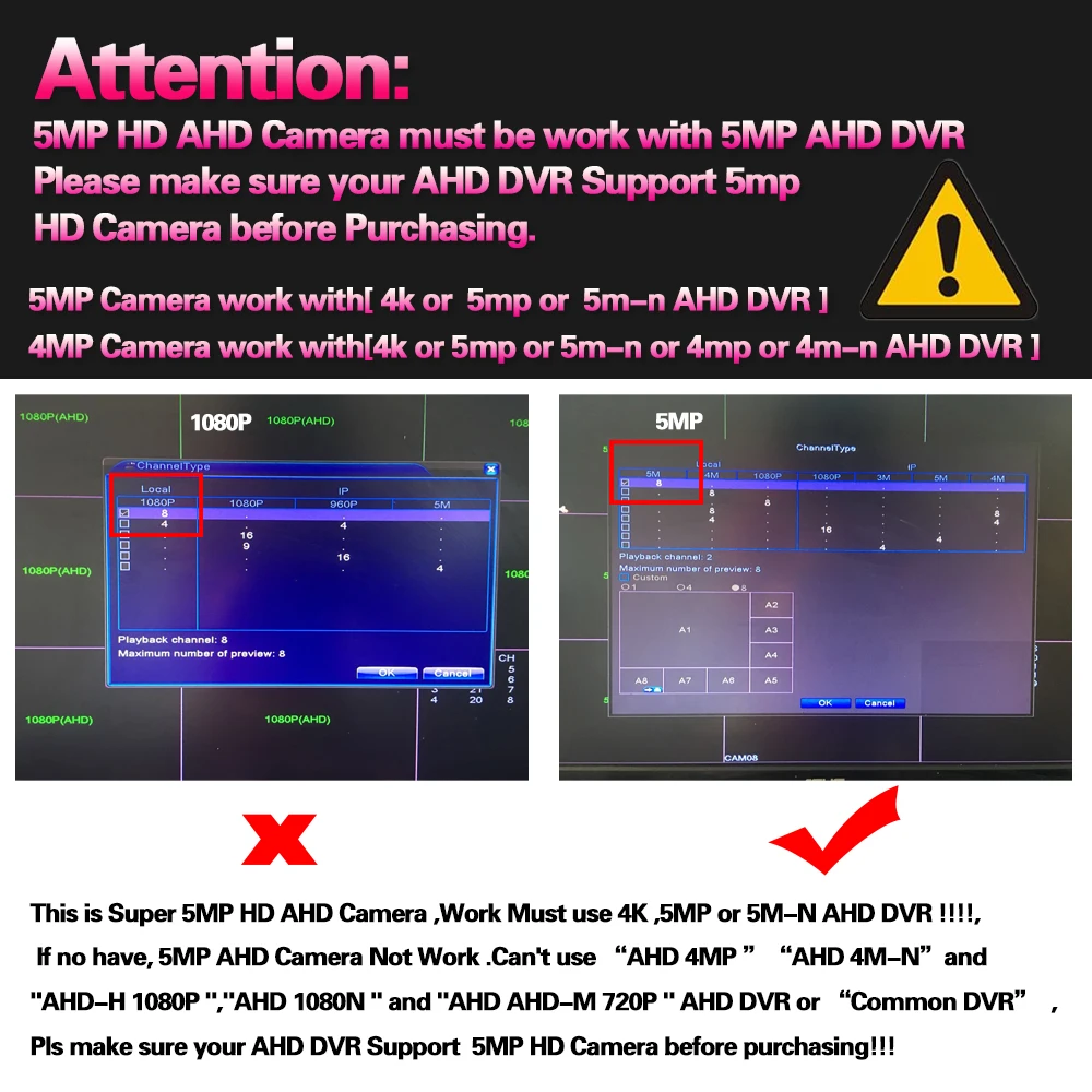 This is Super HD 5MP Camera ,Work Must use 4K AHD DVR or 5MP AHD DVR or 5M-N AHD DVR !!!!, If no have, 5MP AHD Camera Not Work . Can't use “AHD 4MP System””AHD 4M-N System”and”AHD-H 1080P System”,”AHD 1080N System” and “AHD AHD-M 720P System” AHD DVR or “Common DVR” ,The 5MP AHD Camera Not Work!!!