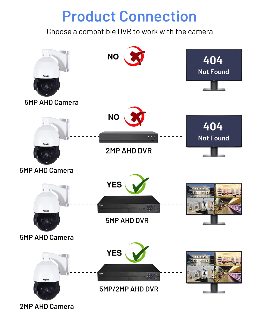 Note: Please use a compatible DVR with the camera, especially when you choose 5MP, please make sure your DVR support AHD signal and 5MP resolution!