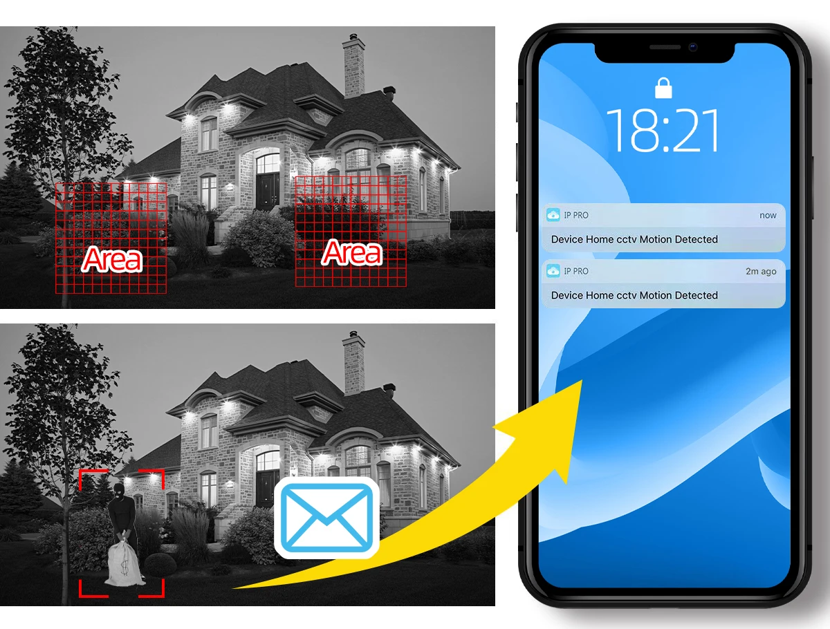 When you are outside or at home, it will send alert notifications to your phone once it detected any movement in the monitoring area to keep your home safe. No matter where you are, this security camera will be a reliable protector for your home and let you be assured.