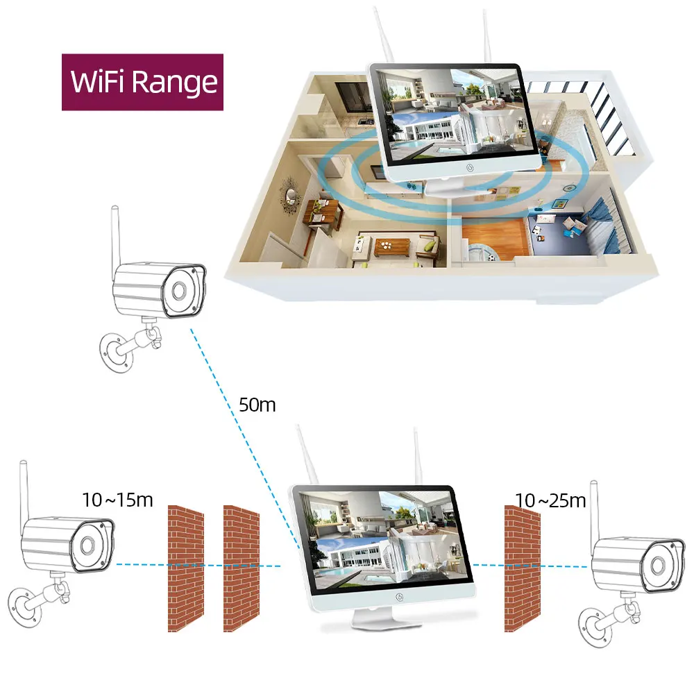 Wireless connections between cameras and NVR,Up to 50 Meters Wireless Transmission(no obstacle)