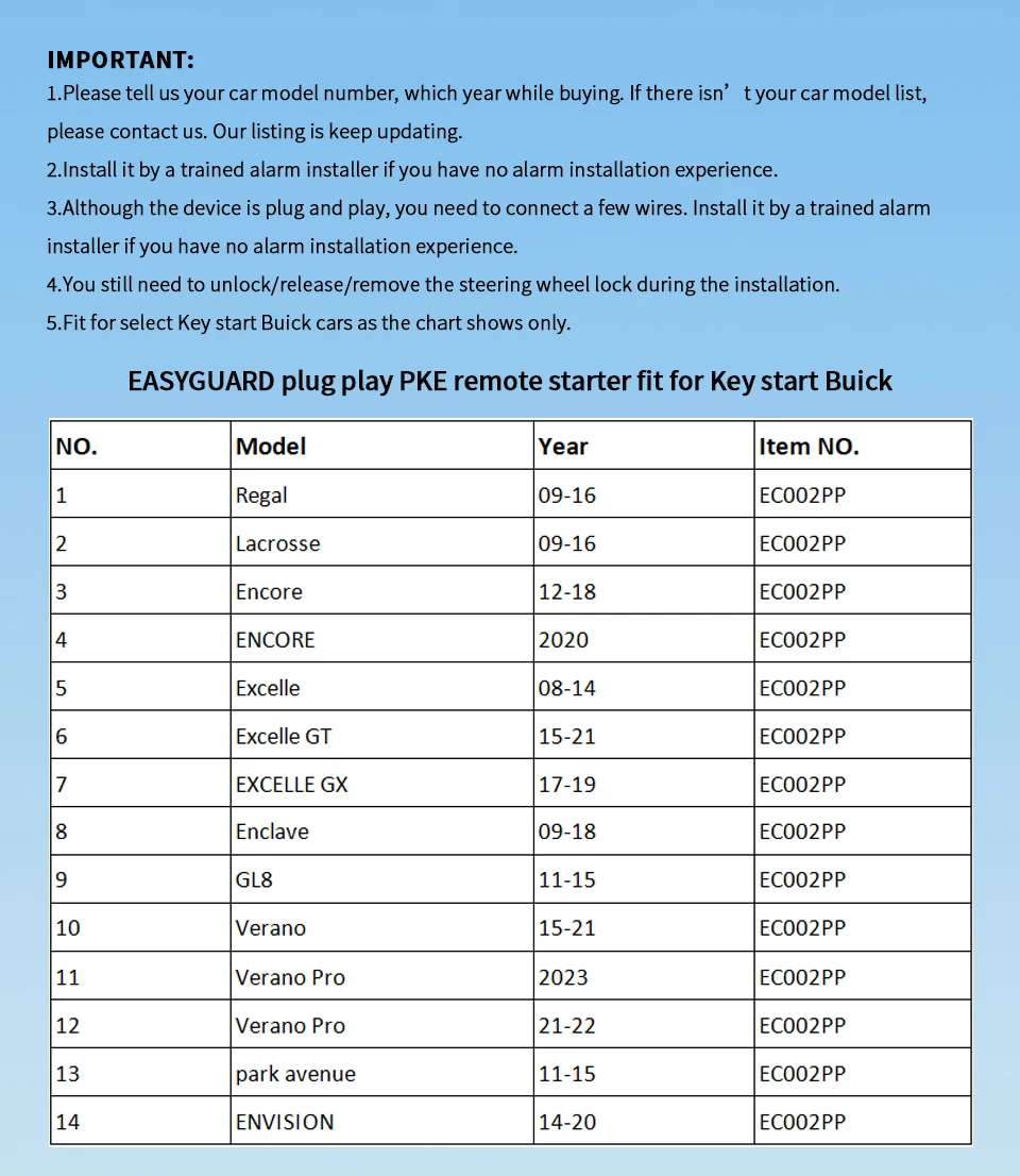 This item can only fit for Regal 09-16/Lacrosse 09-16/ Encore 12-18/ENCORE 2020/Excelle 08-14/Excelle GT 15-21/EXCELLE GX 17-19 original car is keyto start.