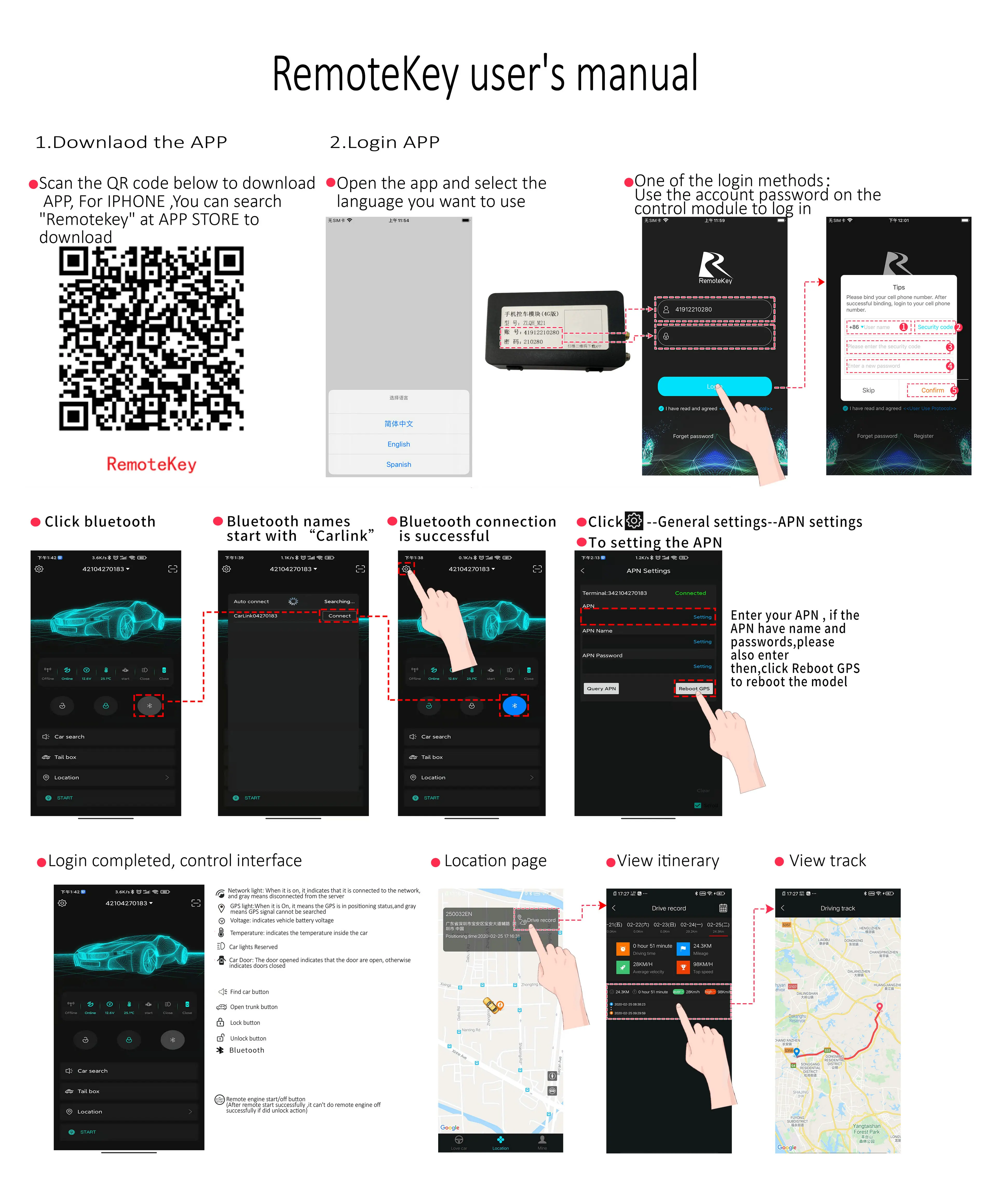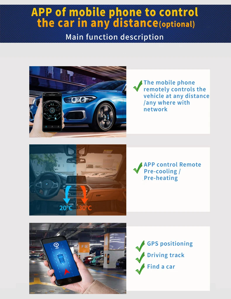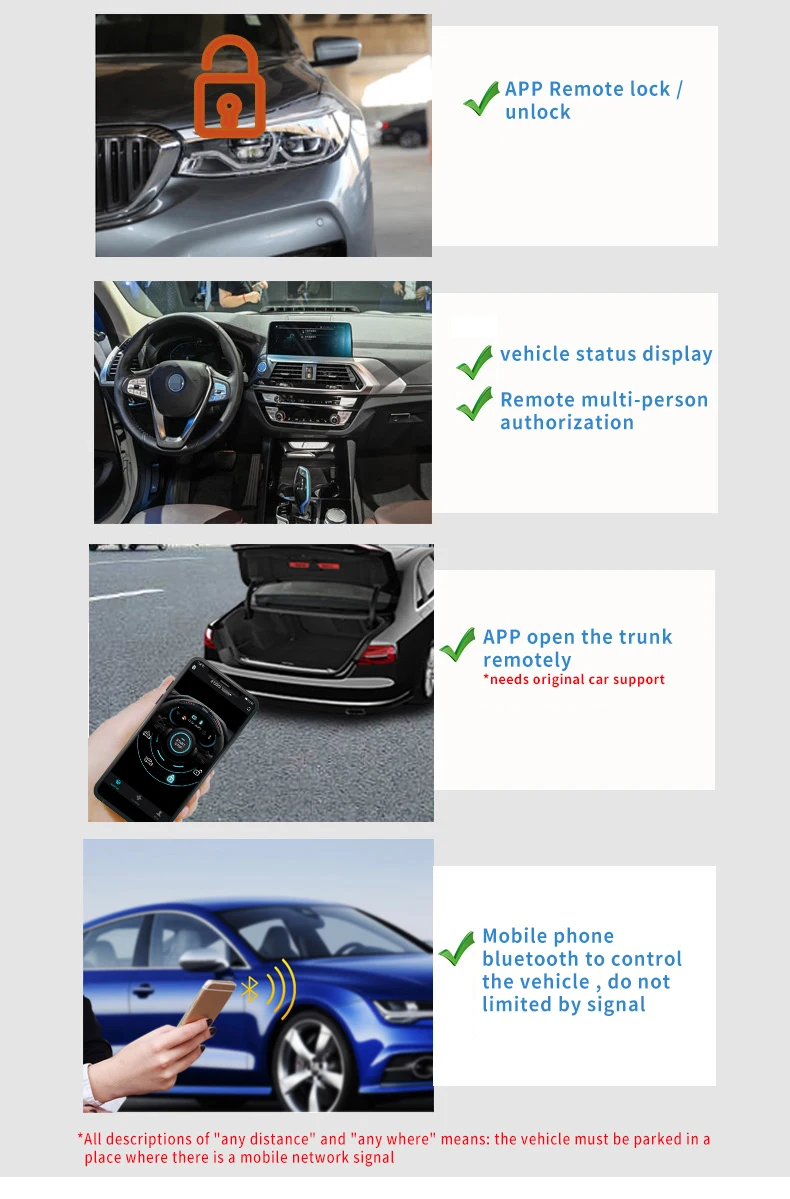 5.For 4G , Bluetooth and NFC module ,User can monitor their vehicles with the APP on the phone, no need to take the remote control. Your phone is your car key. You can download the APP after installation completed.