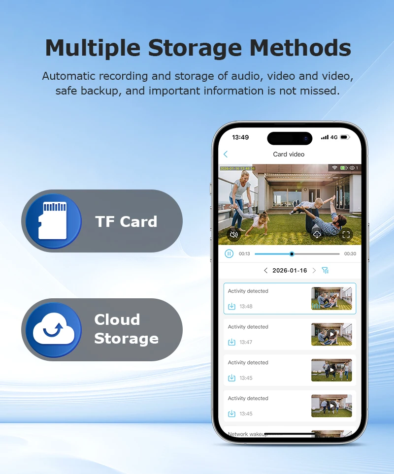 •The camera supports cloud storage and local TF card storage.