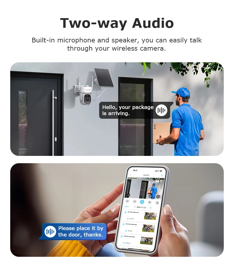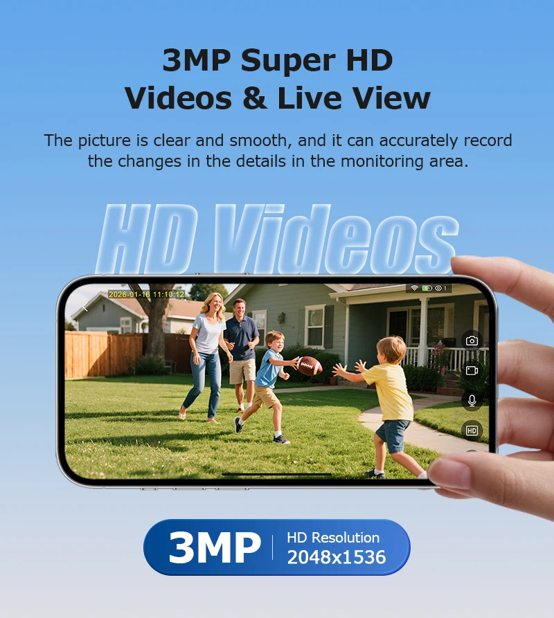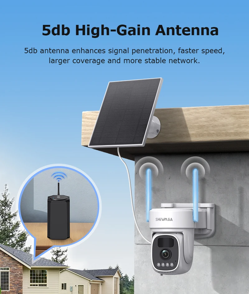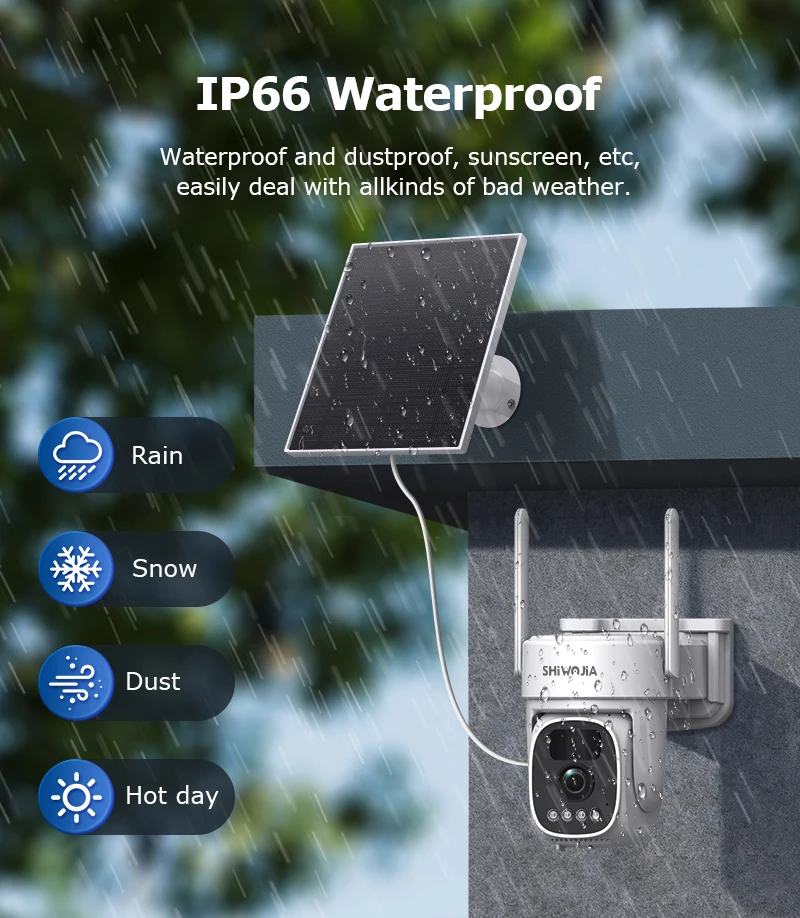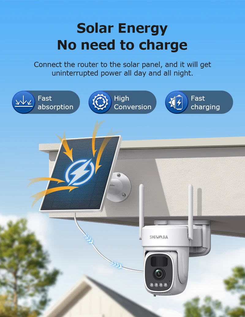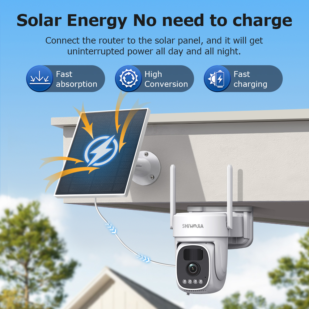 •Solar Cam Camera: Equipped with a 3W solar panel and built-in 8000MA high-capacity lithium battery, it is durable and long-lasting