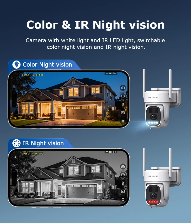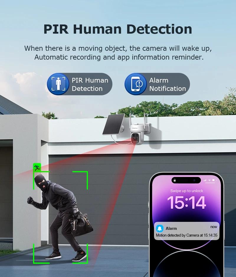 •Solar camera camera: supports dual mode switching between infrared night vision and full-color night vision