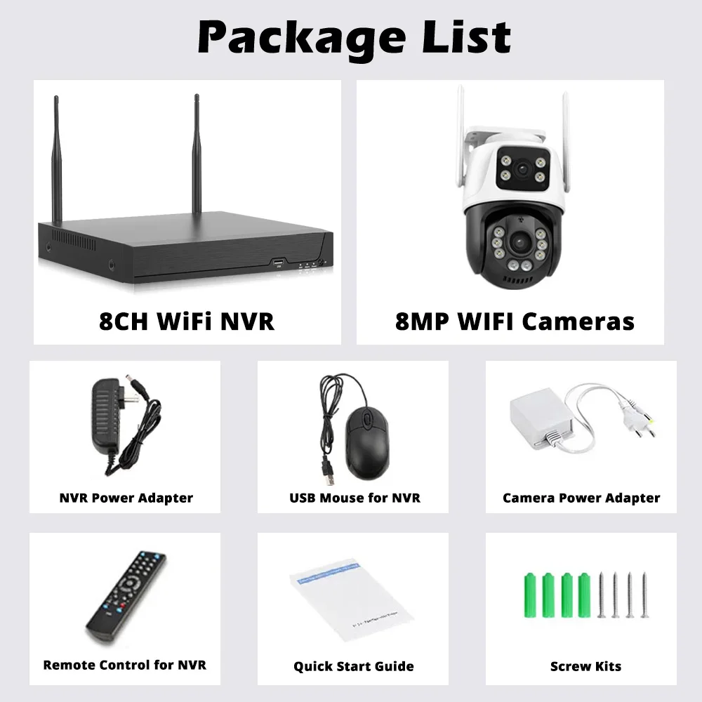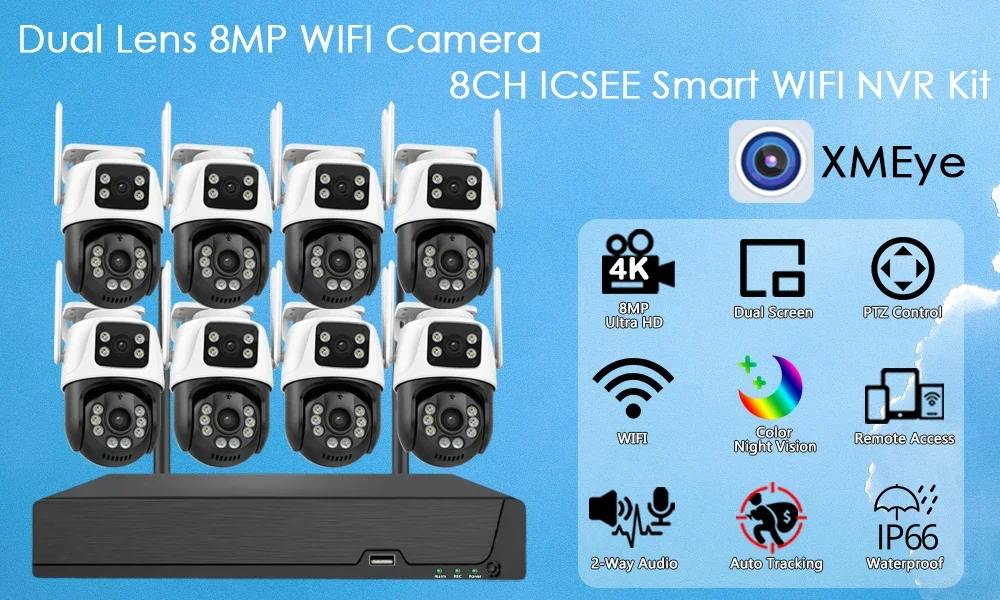 Smart 8CH Wifi Wireless NVR Kit ICSee Outdoor Wifi Security CCTV Cameras 8MP 4K Dual Lens Smart Surveillance CCTV System XMEye