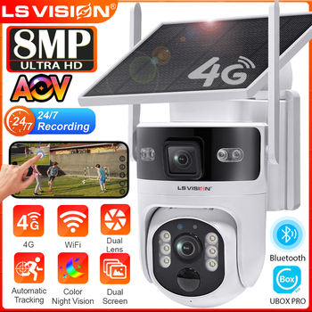 LS VISION 8MP 4G LTE Solar Camera Dual Screen AOV+PIR Mode WiFi Security Camera 7/24 Recording PIR Detection Auto Tracking CCTV