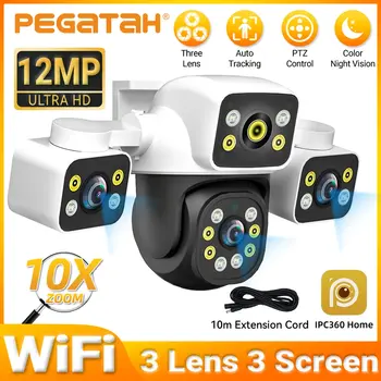 PEGATAH 6K 12MP Three Screens Outdoor WiFi Security Camera 10X Zoom Three Lens Human Auto Tracking IP66 Waterproof CCTV Cameras